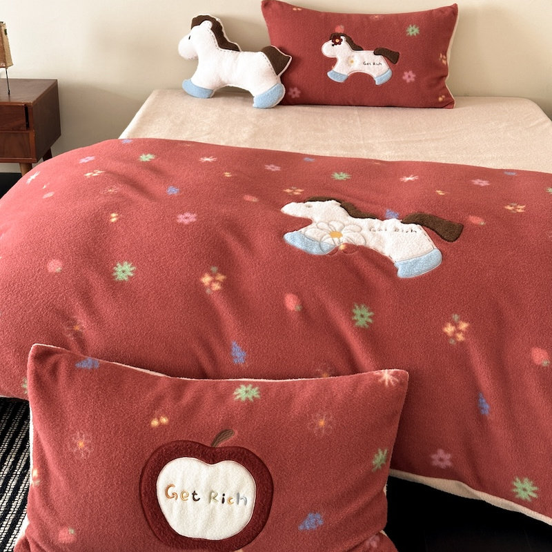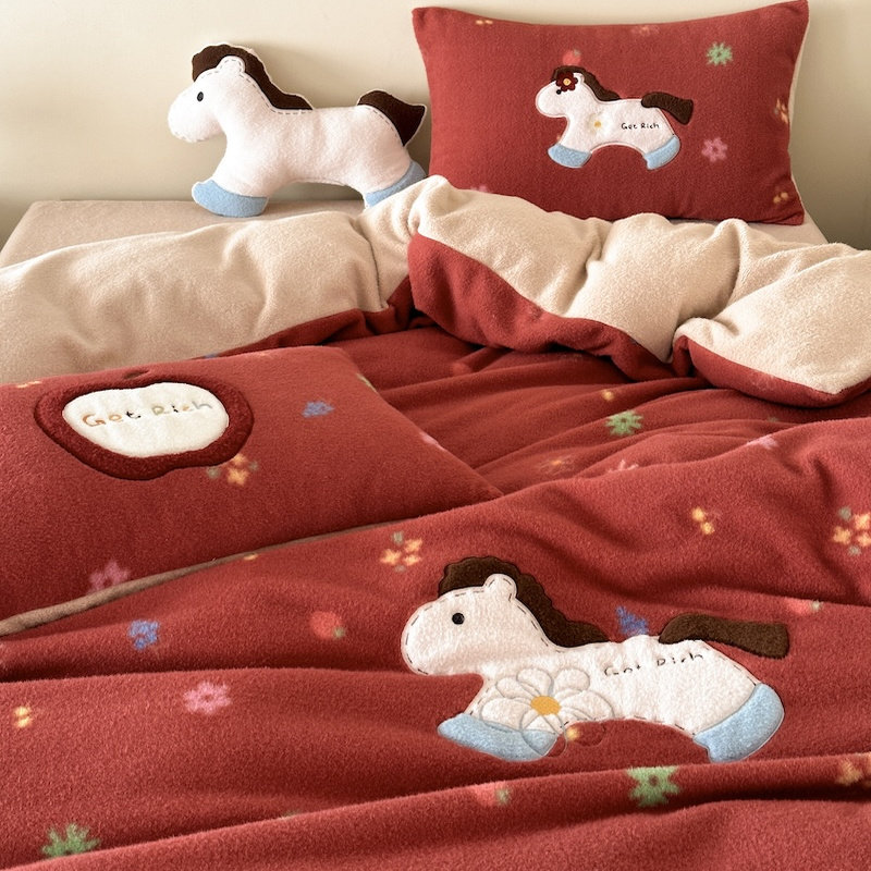 新年喜庆小马秋冬加厚仿羊绒牛奶绒保暖床上四件套法兰绒珊瑚绒