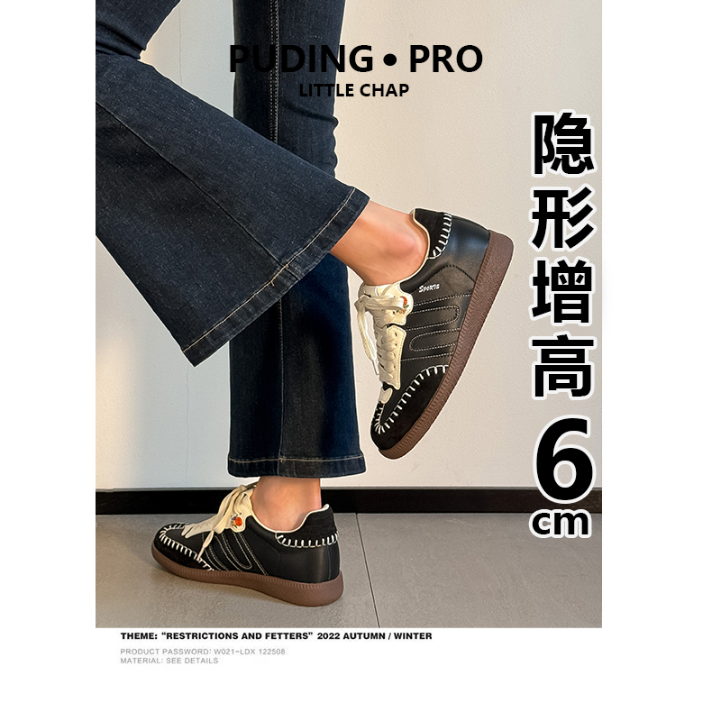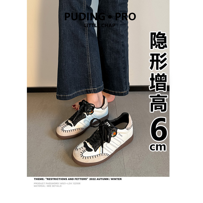 内增高复古德训鞋女秋冬款小个子真皮刺绣黑白系带运动休闲鞋板鞋