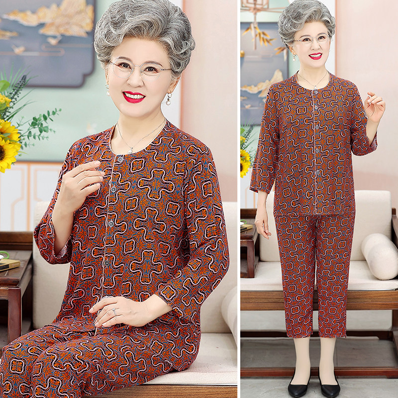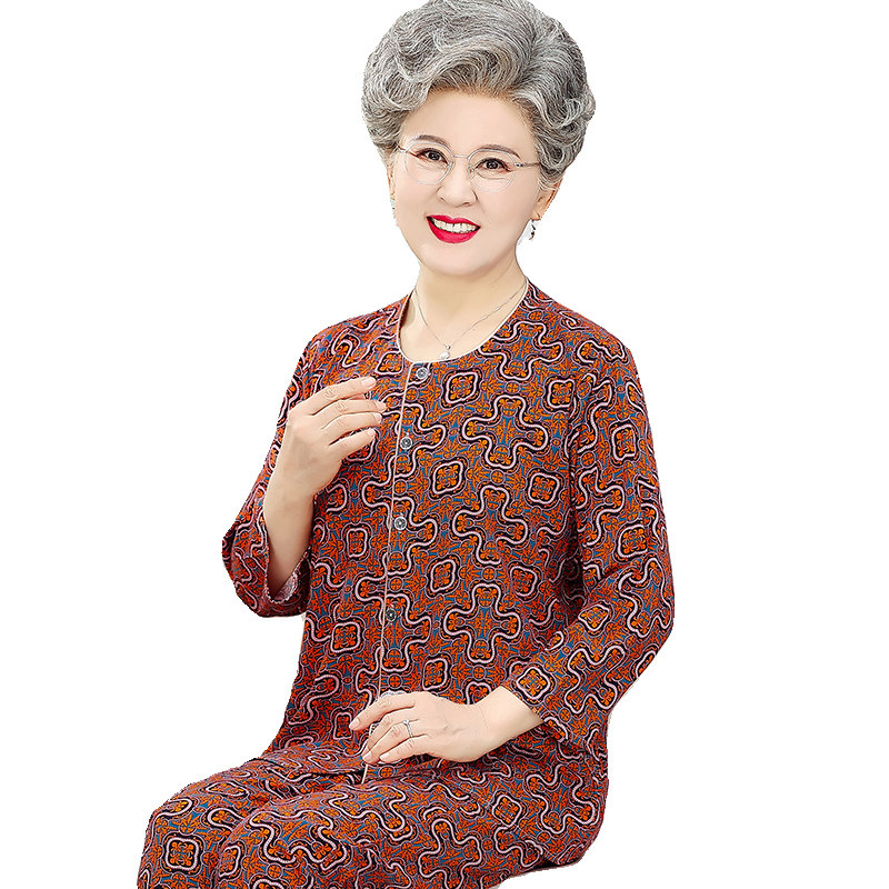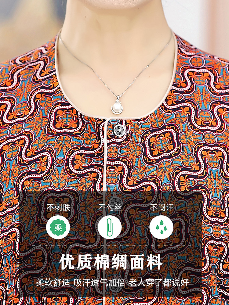老年人夏装女套装奶奶装七分袖有口袋上衣老人衬衫妈妈纯棉绸衣服