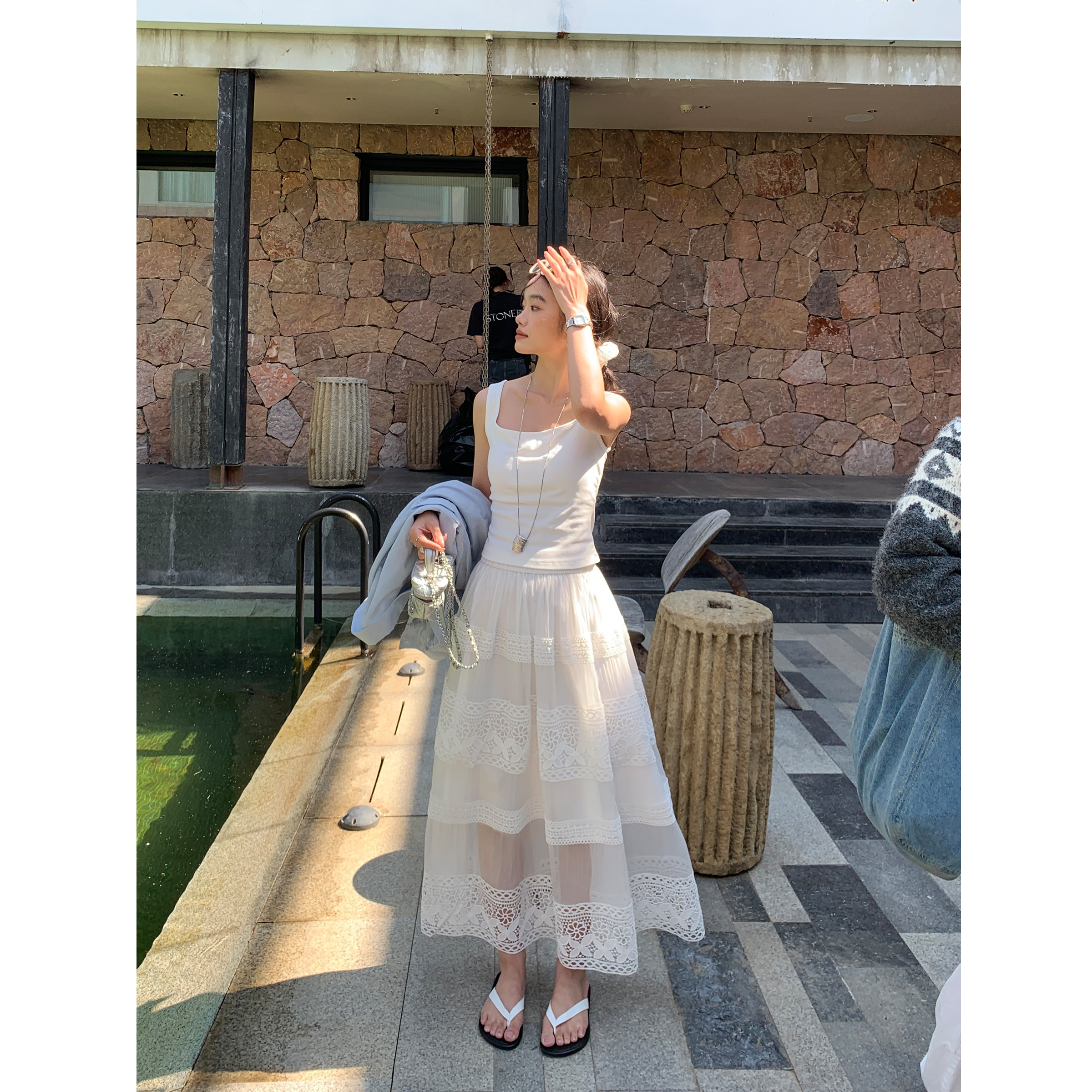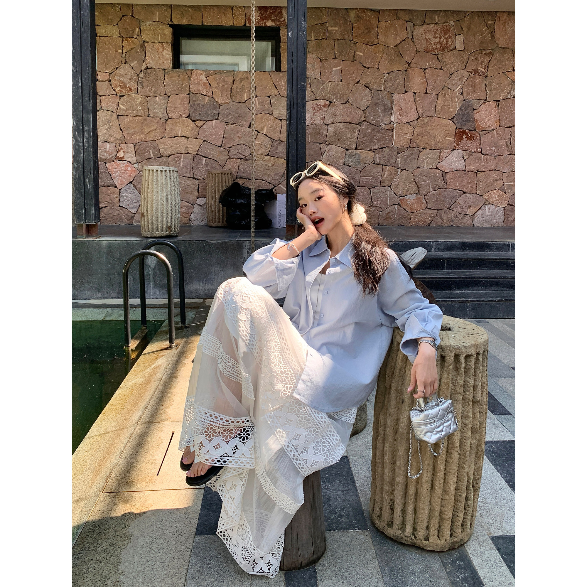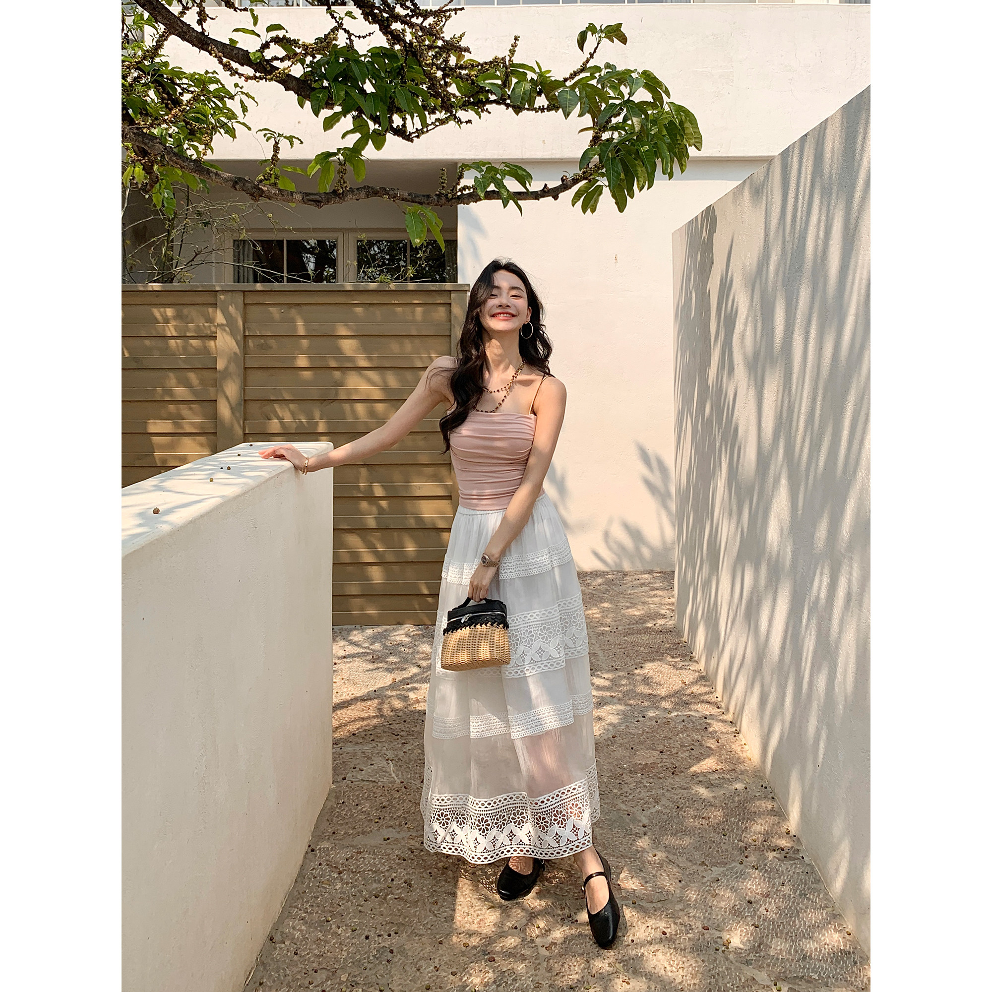 pusumede【现货7折】轻薄纱感|重工镂空蕾丝花边半身裙女宽松长裙