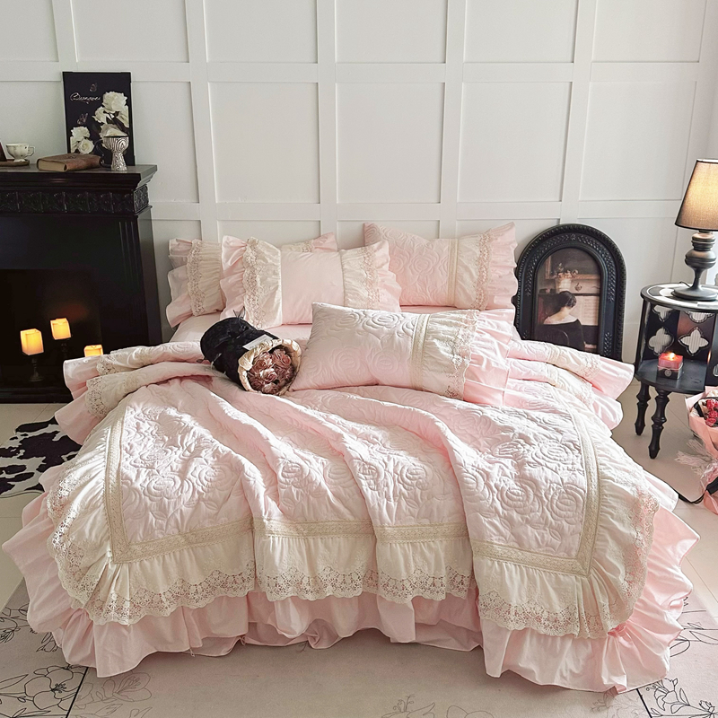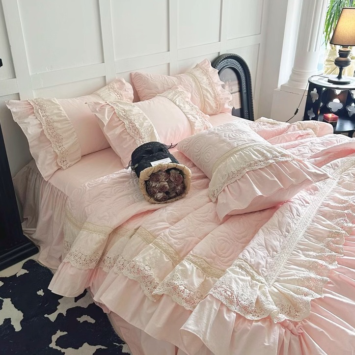 公主风全棉色织水洗棉四件套韩版纯棉夹棉加厚被套粉色床裙款床品