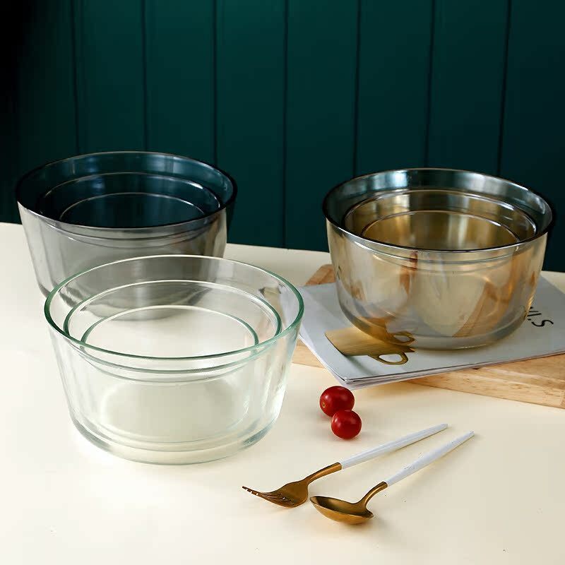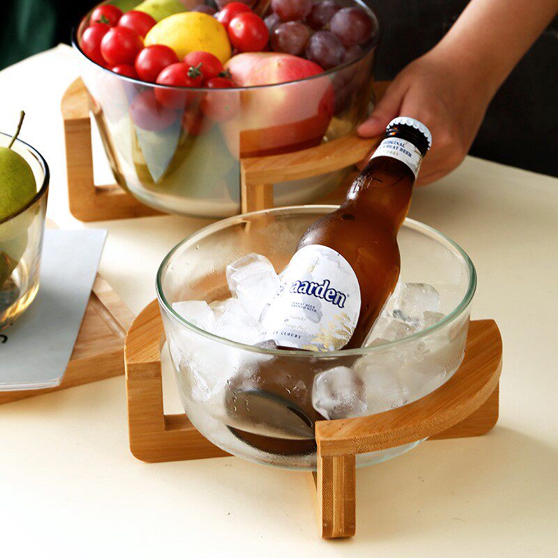 北欧轻奢玻璃碗高级带木架水果盘沙拉干果盘家用日式简约现代客厅