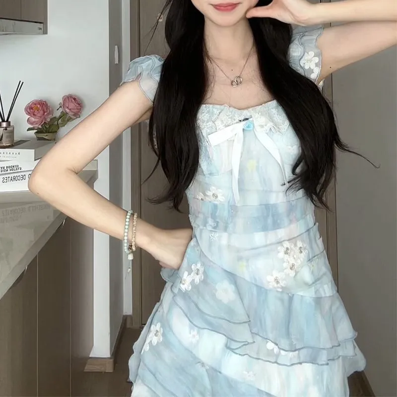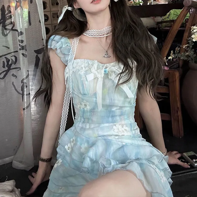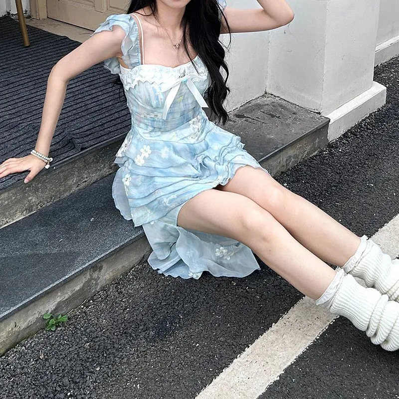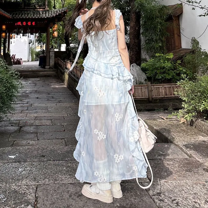 法式度假蓝色连衣裙2025年夏季新款长拖尾无袖氛围感吊带连衣裙女