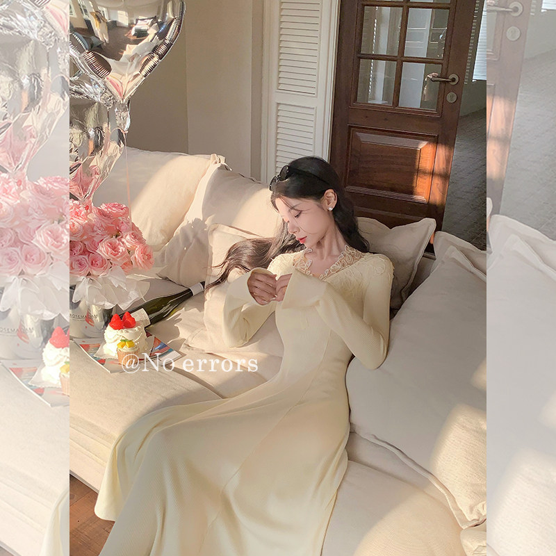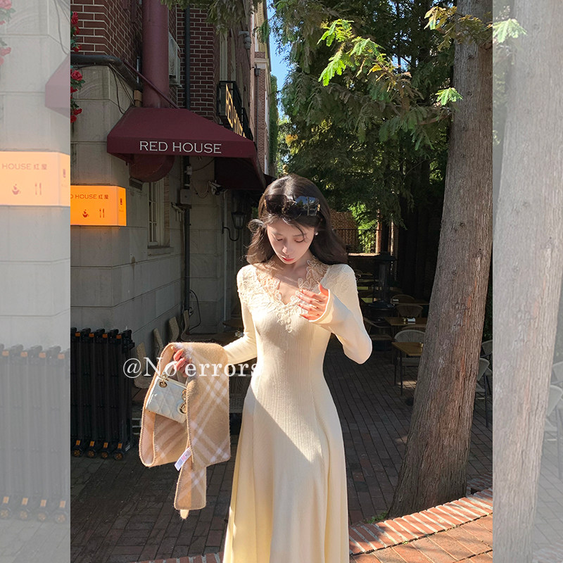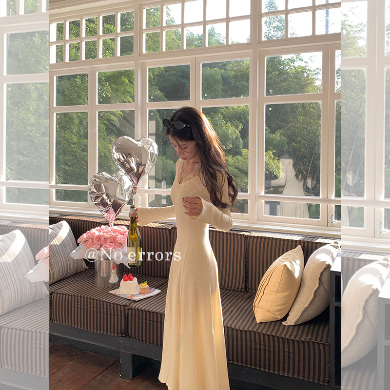 不出错No errors 重工蕾丝拼接v领大摆针织连衣裙 2025冬新款