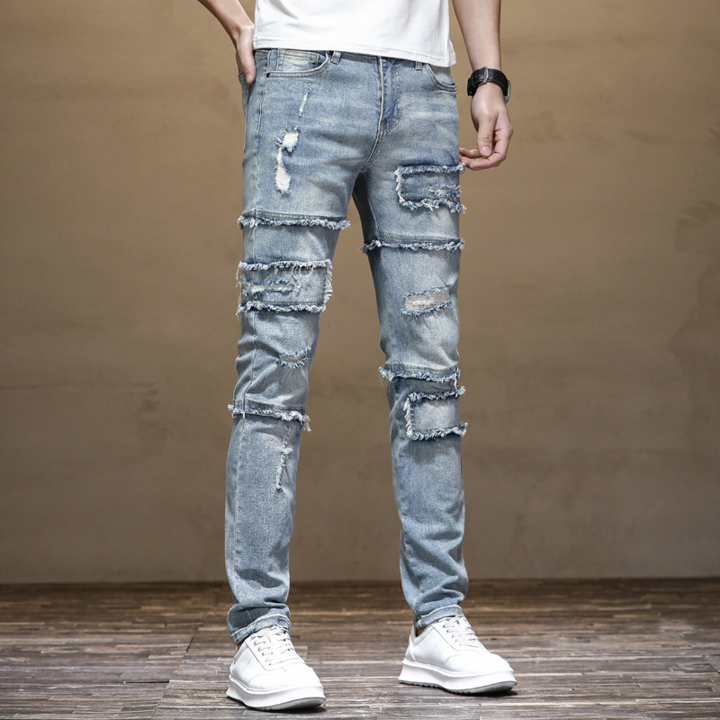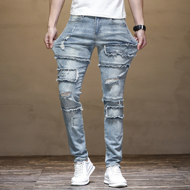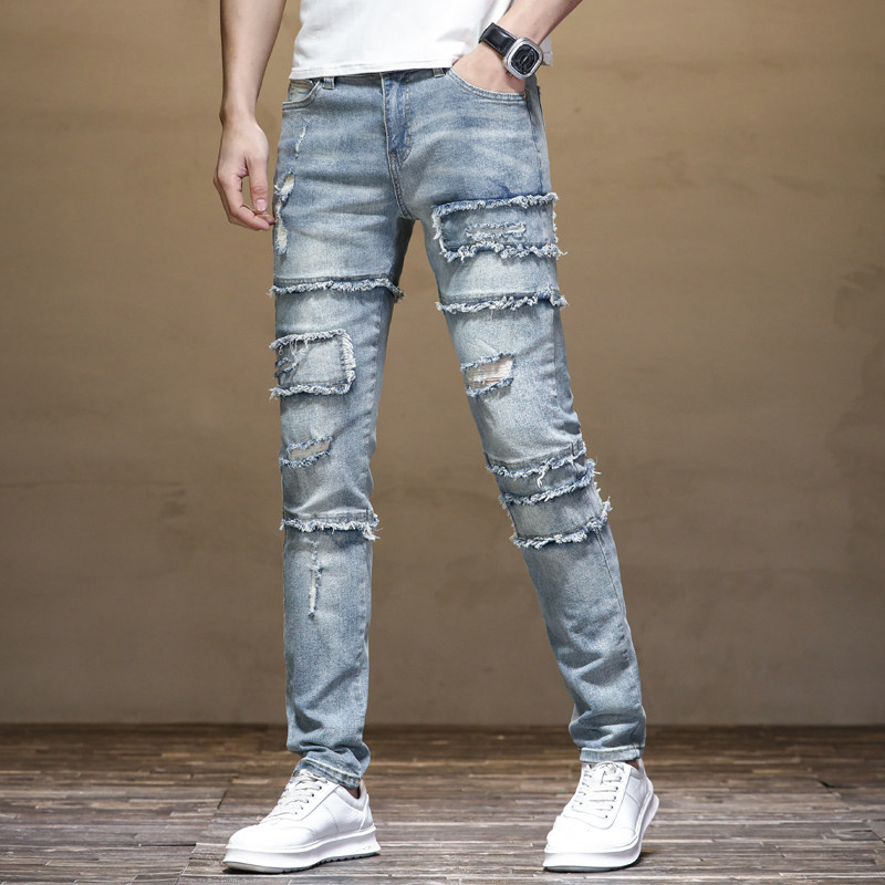 新款秋冬弹力破洞拼接牛仔裤男修身小脚显瘦个性毛边潮流弹力长裤