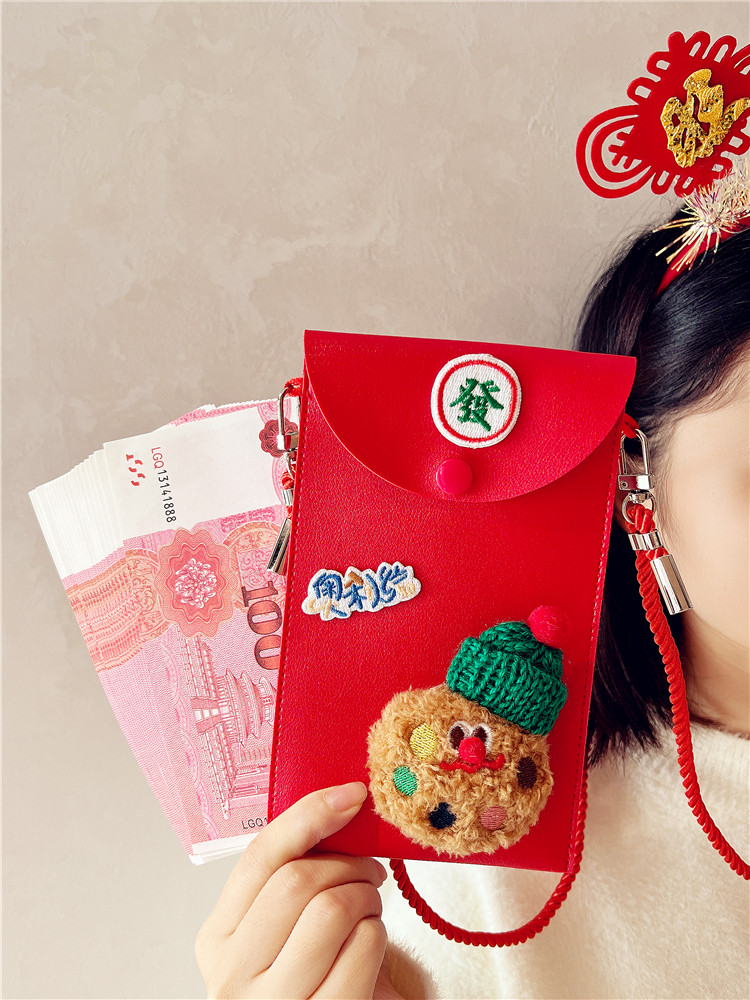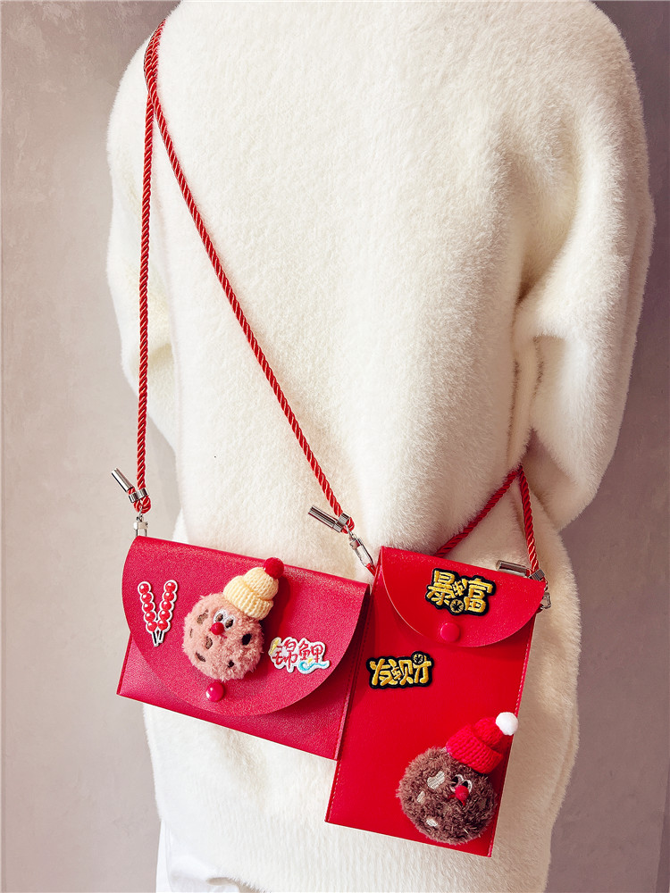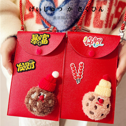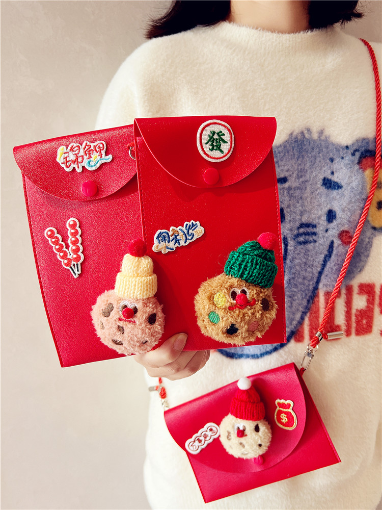 皮质网红利是封立体毛绒玩偶手工diy斜跨可背带挂绳红包手机包袋