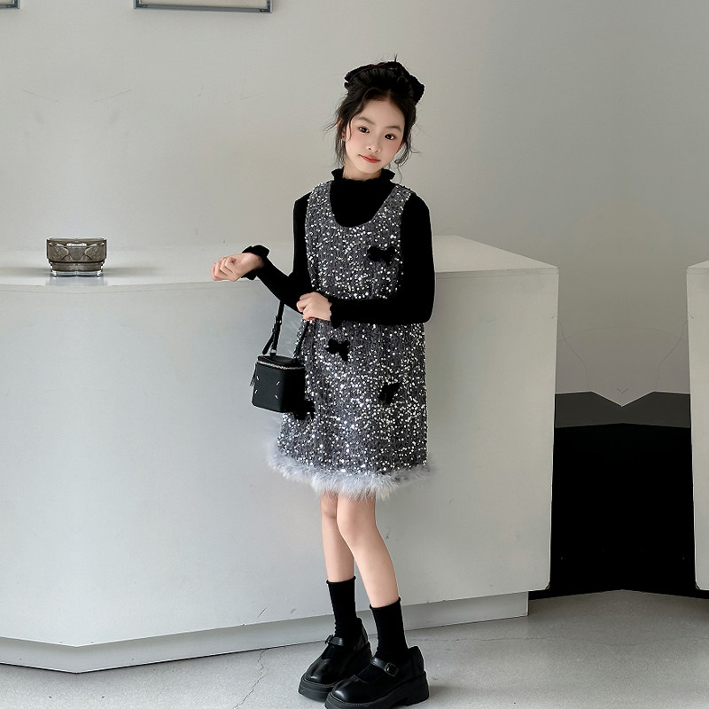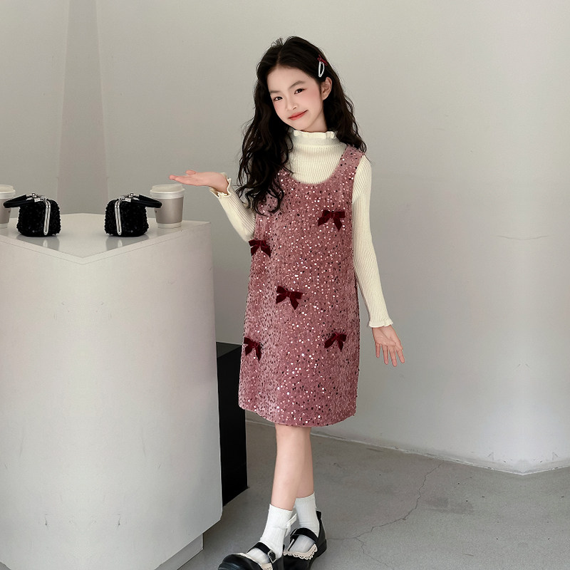 女童春秋季新款连衣裙2026新款中大童蝴蝶结亮片背心裙舞台礼服裙