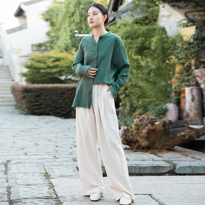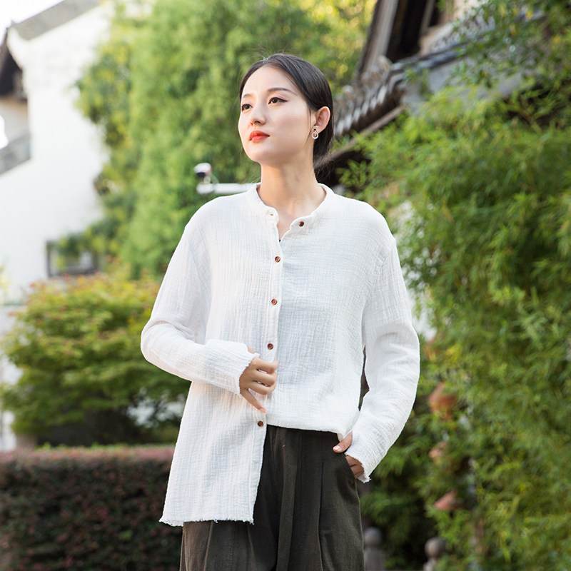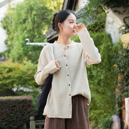 复古文艺竹节棉麻长袖衬衫原创中式柔软百搭女式衬衣亚麻立领上衣