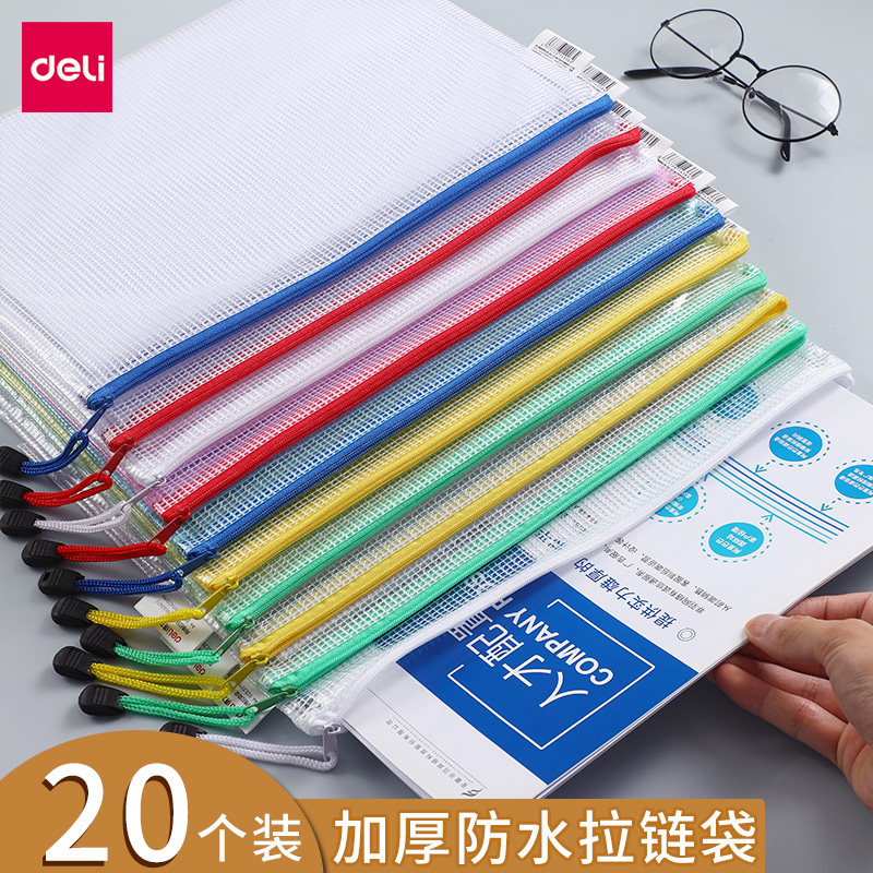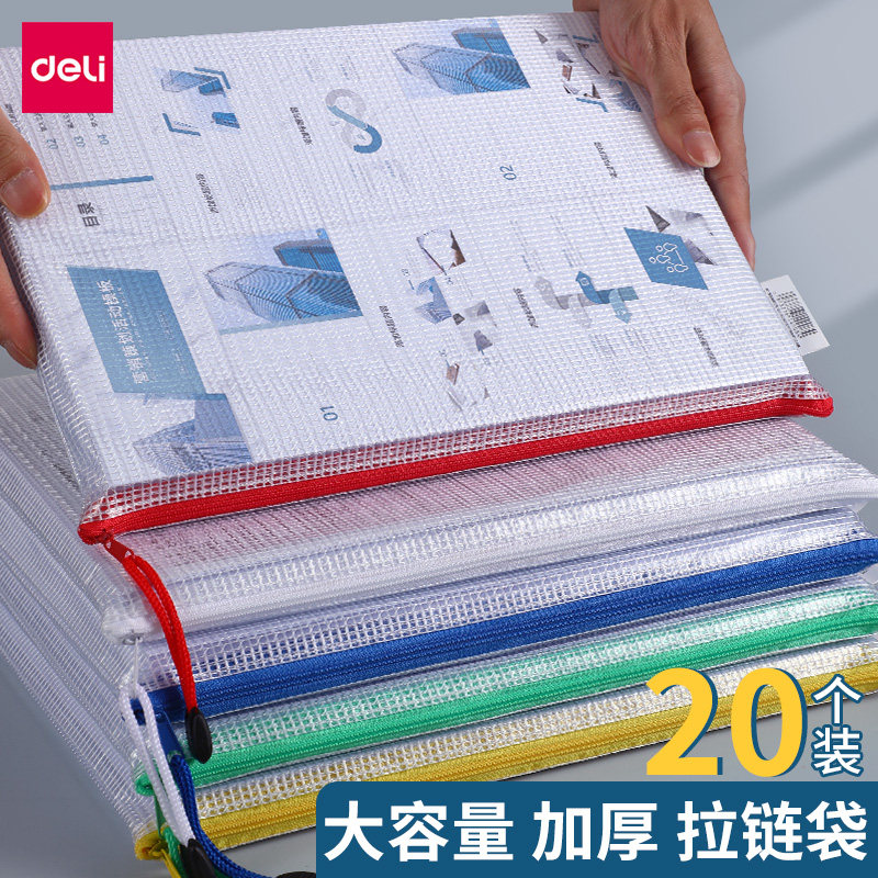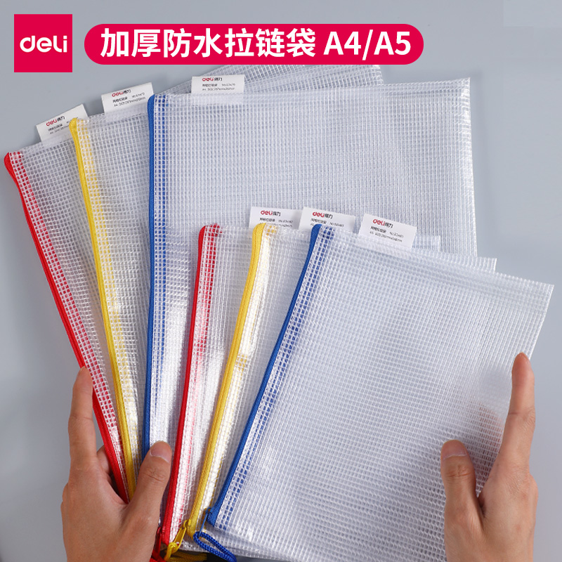 得力透明文件袋防水拉链式大容量加厚收纳小学生考试专用A4书袋塑料网格学生作业科目试卷资料分类A5学习档案