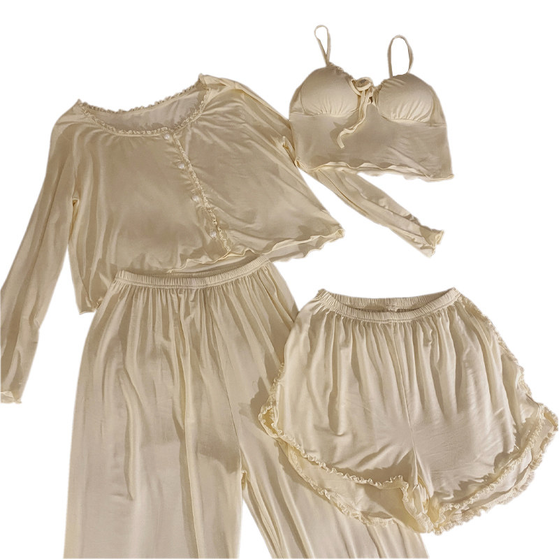 莫代尔睡衣女春夏款长袖三件套装高级感带胸垫性感吊带纯棉家居服