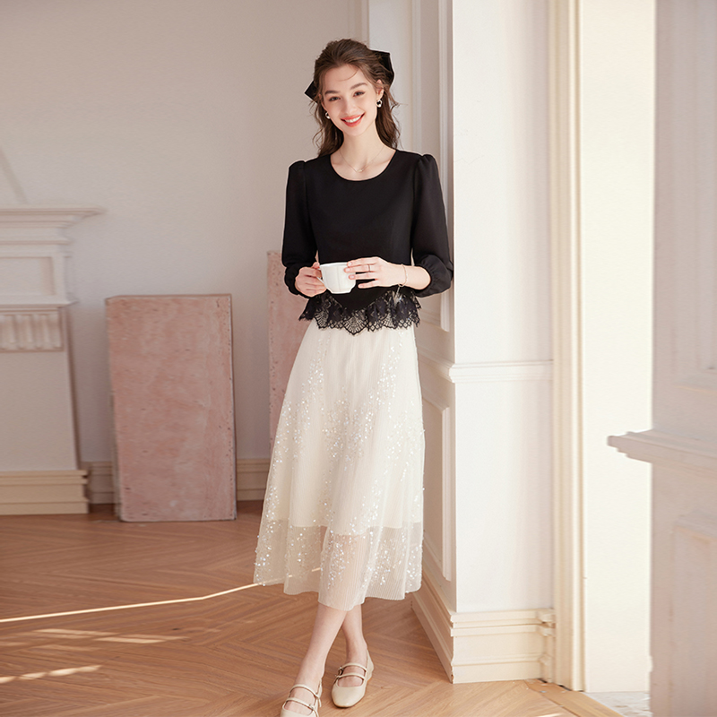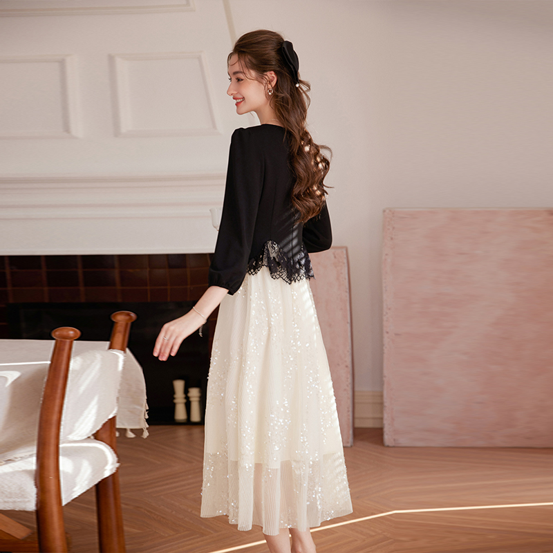 白鹿语赫本风亮片网纱拼接连衣裙女2025春新款法式名媛气质长裙