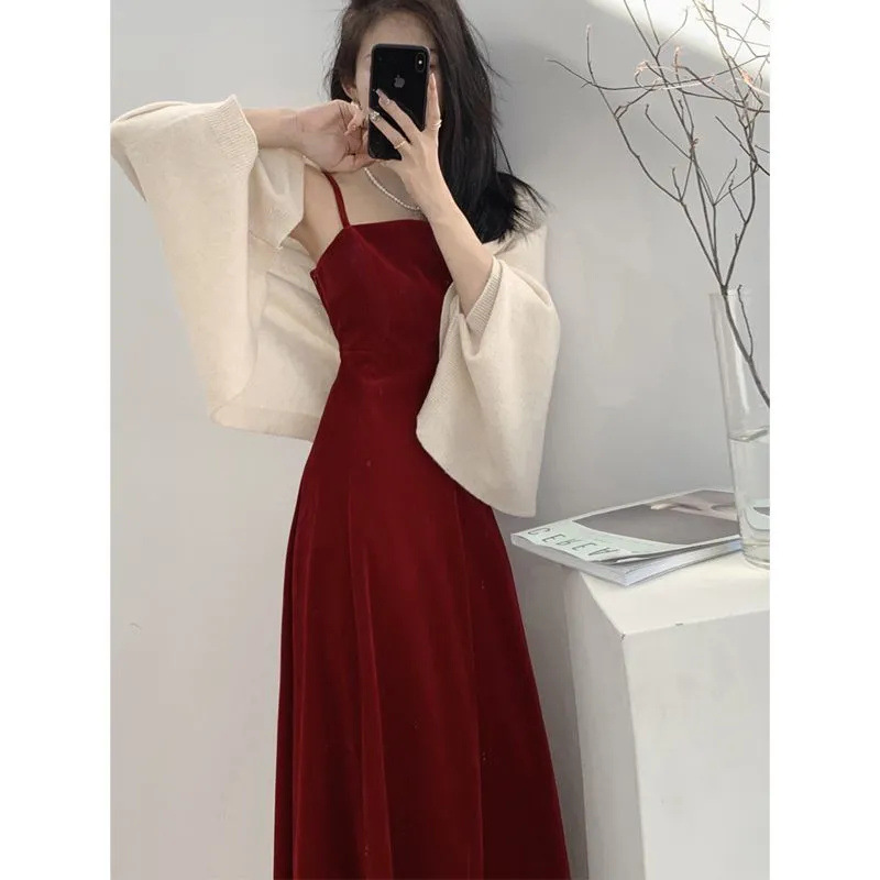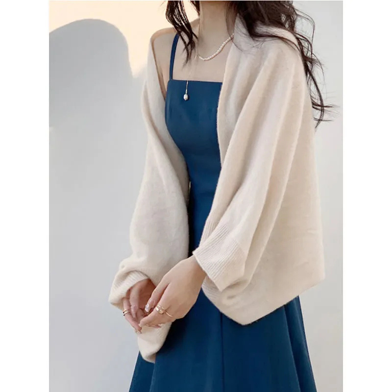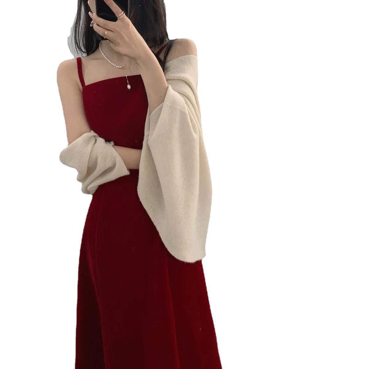 X新款韩系纯色收腰显瘦吊带连衣裙女夏季温柔气质防晒披肩两件