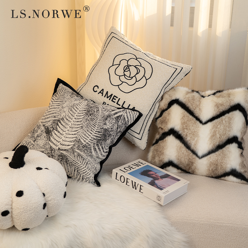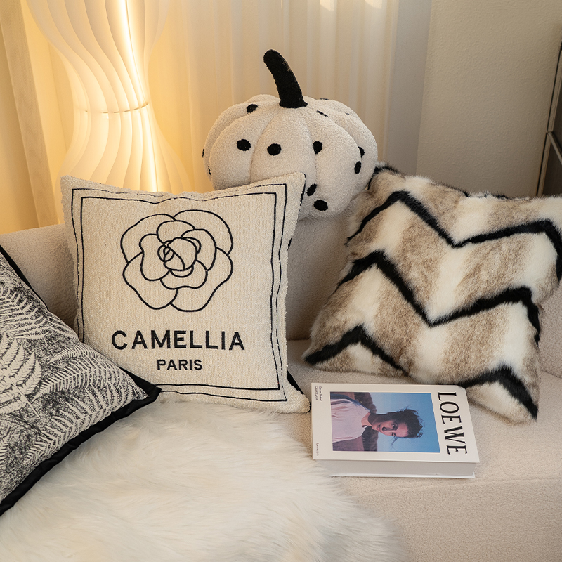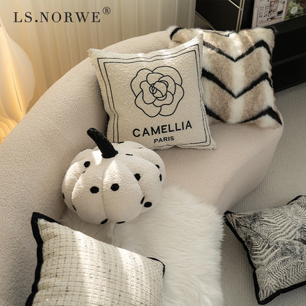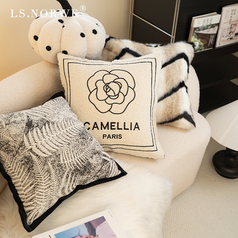 黑白法式抱枕高级感样板间软装客厅沙发靠枕装饰山茶花靠背靠垫