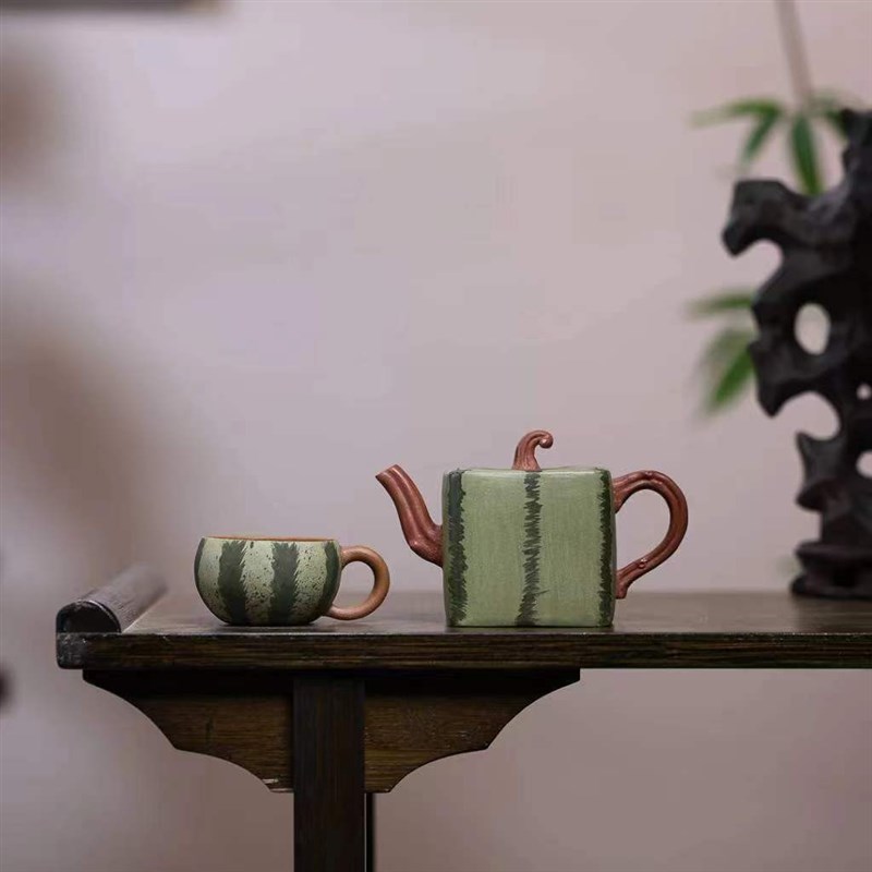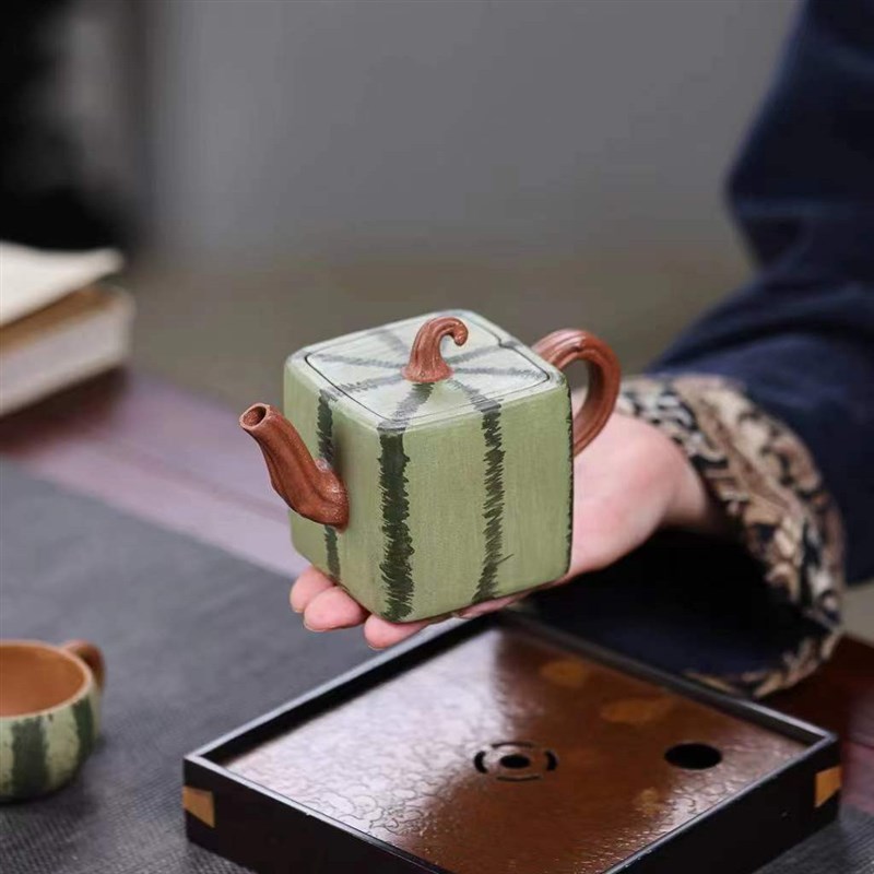 宜兴原矿紫砂方西瓜壶仿生器全手工薄胎段泥粉浆茶具茶壶