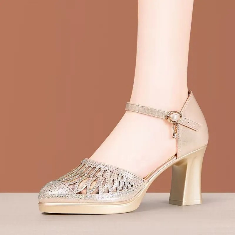 2025夏新款包头凉鞋女粗跟厚底镂空水钻中空外穿旗袍走秀凉鞋单鞋