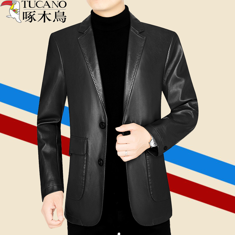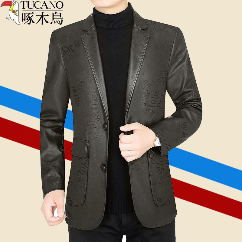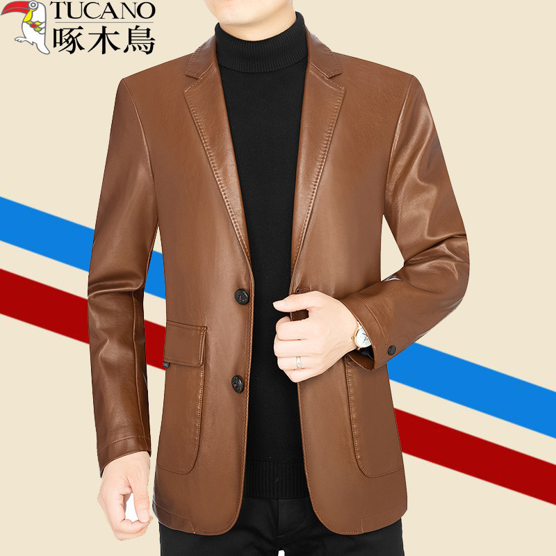 啄木鸟男士休闲PU皮衣外套男2025春秋季新款中年夹克皮西服爸爸装