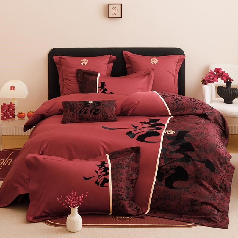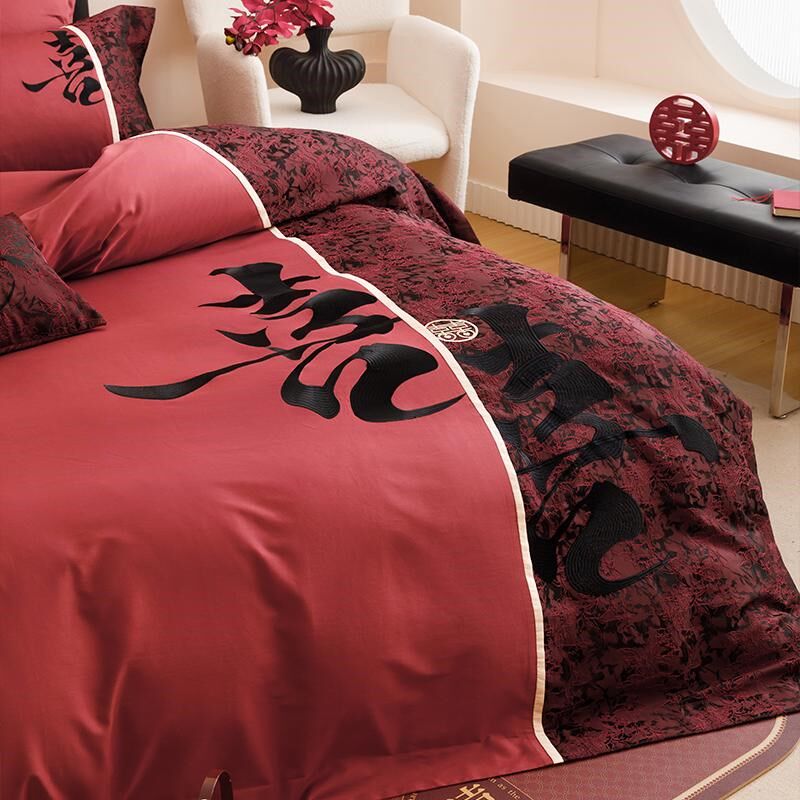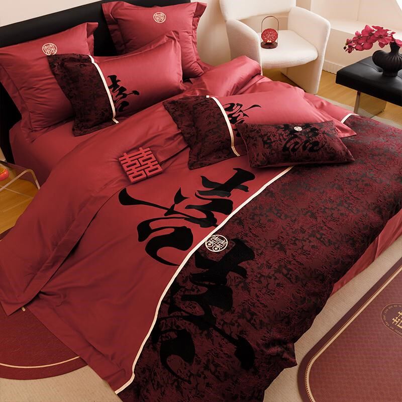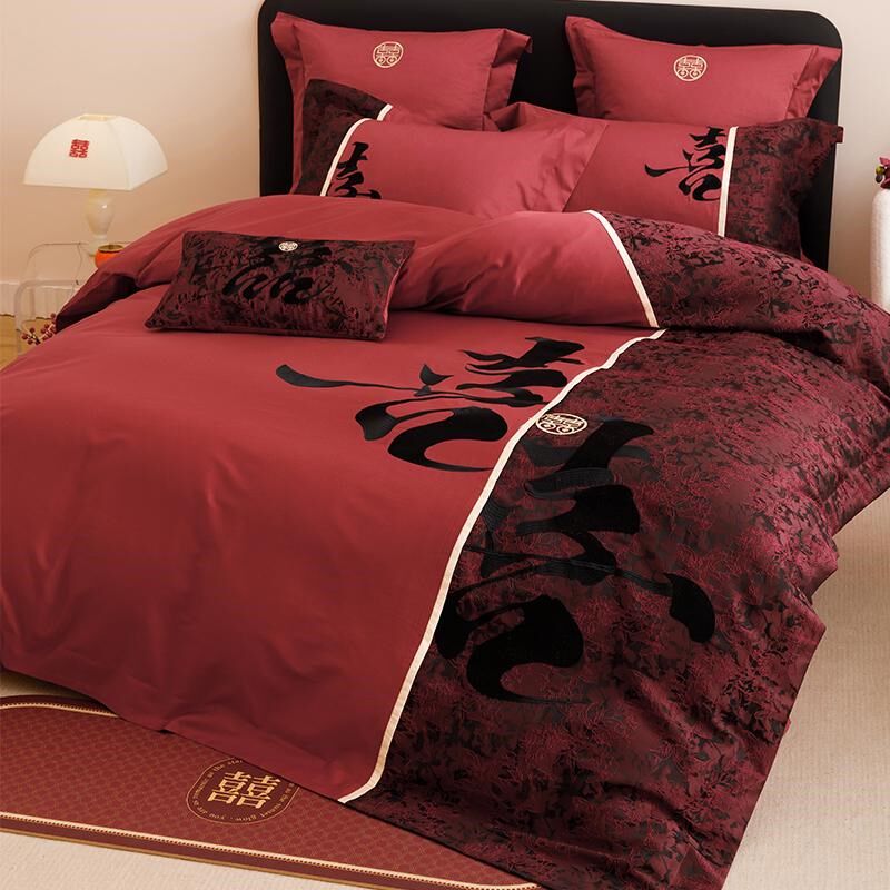 中古风喜庆c全棉长绒棉刺绣四件套喜字时尚被套纯棉床单结婚房床