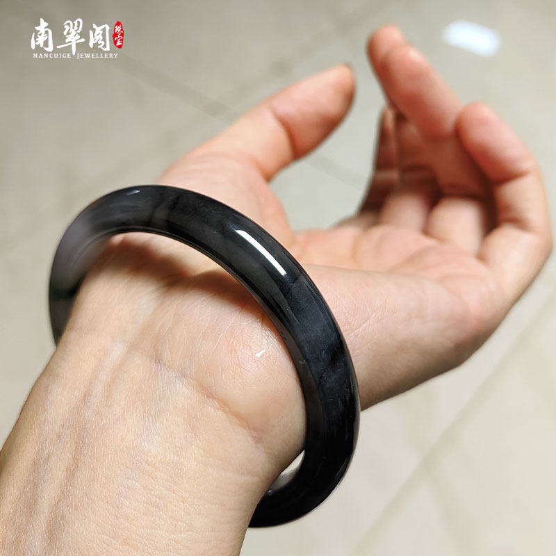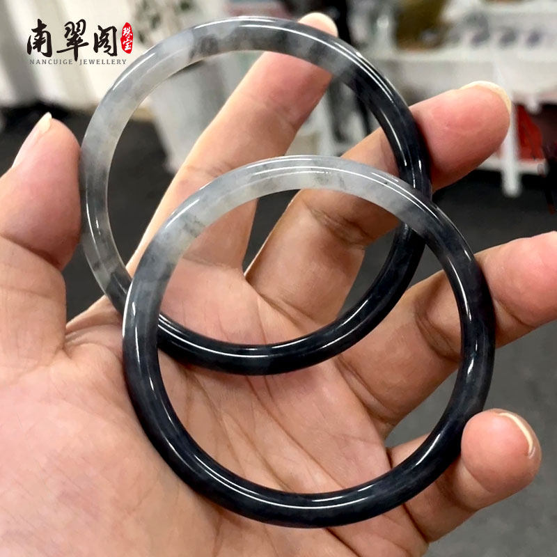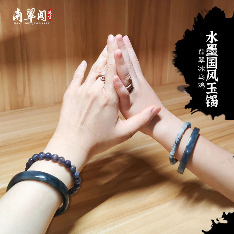 南翠阁半山半水翡翠冰乌鸡手镯黑白水墨天然玉镯叮当一对直播定制