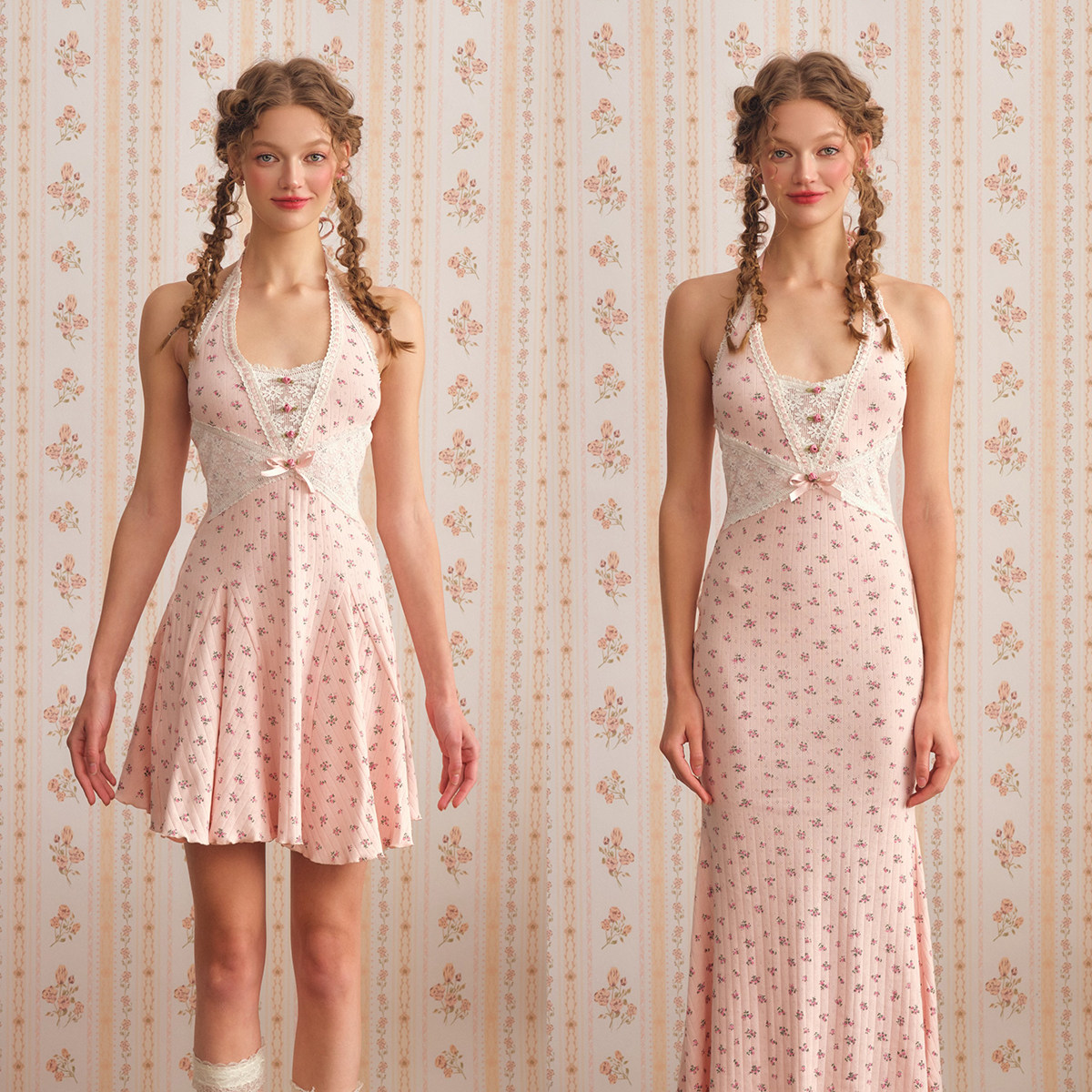 LaceMade 玫瑰果酱 法式甜美碎花挂脖裙长短款粉色连衣裙露背度假