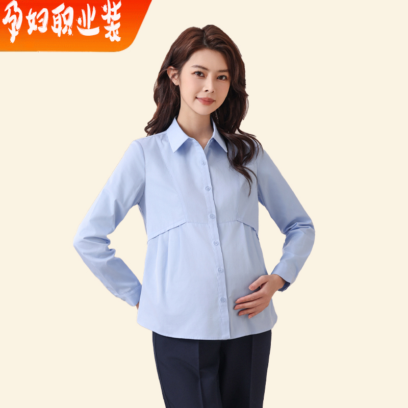 孕妇职业衬衫宽松工装短款白色上衣OL蓝色春秋长袖面试工作服衬衣