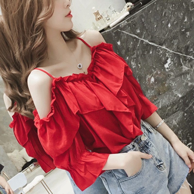 chic新款百搭短袖雪纺衫女夏超仙一字露肩吊带洋气小衫半袖上衣潮