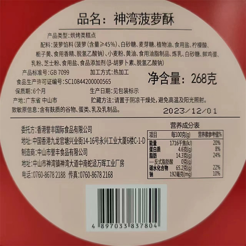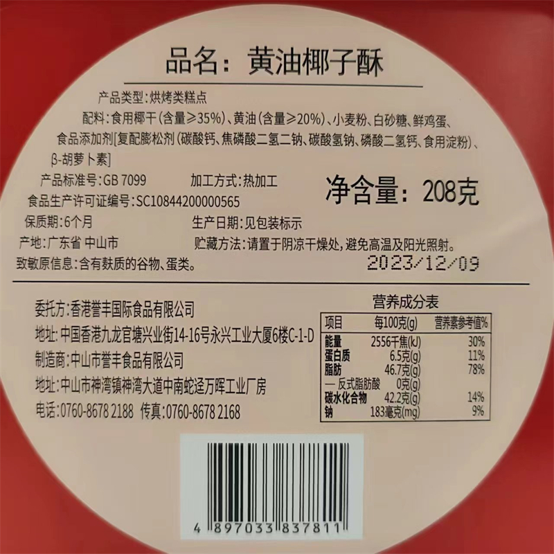 誉丰神湾菠萝酥黄油椰子酥咸蛋黄 208g发2盒包邮招牌手信澳门味道