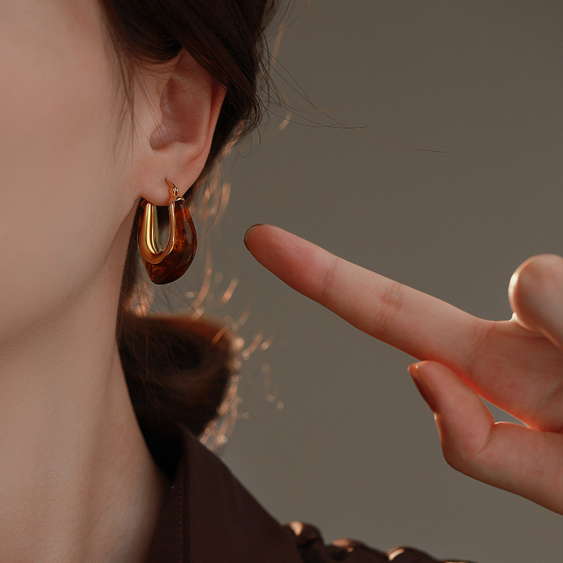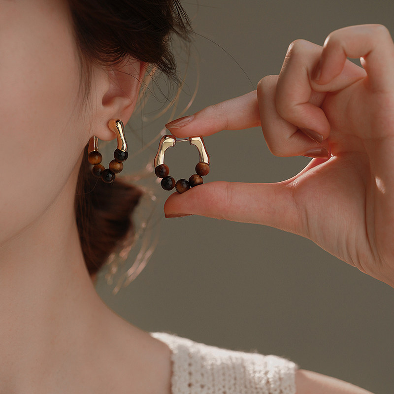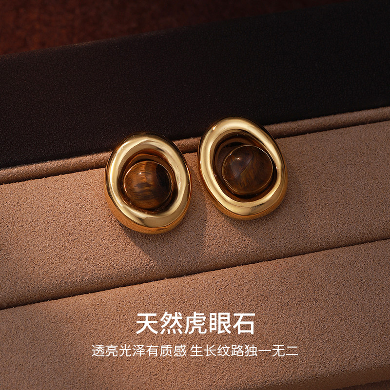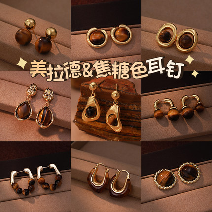 美拉德天然虎眼石耳环女小众设计感高级法式复古耳圈秋冬耳扣耳饰