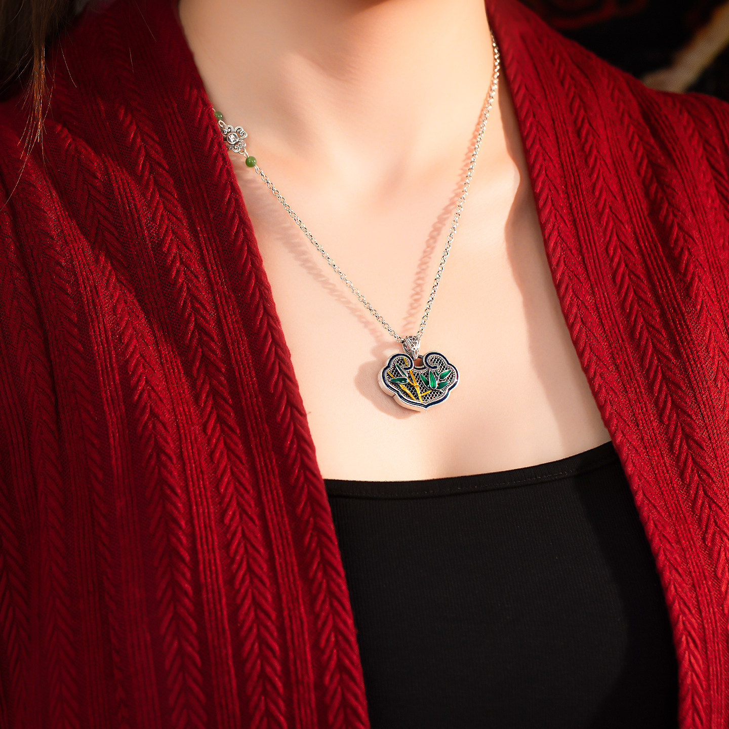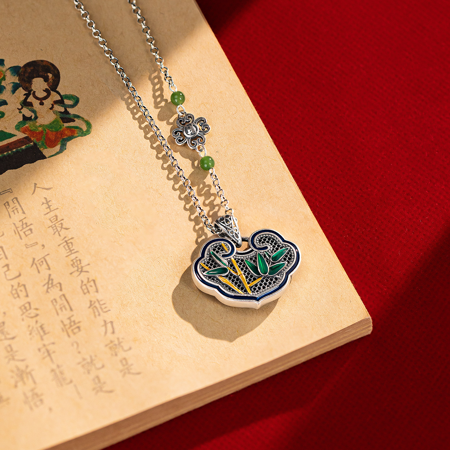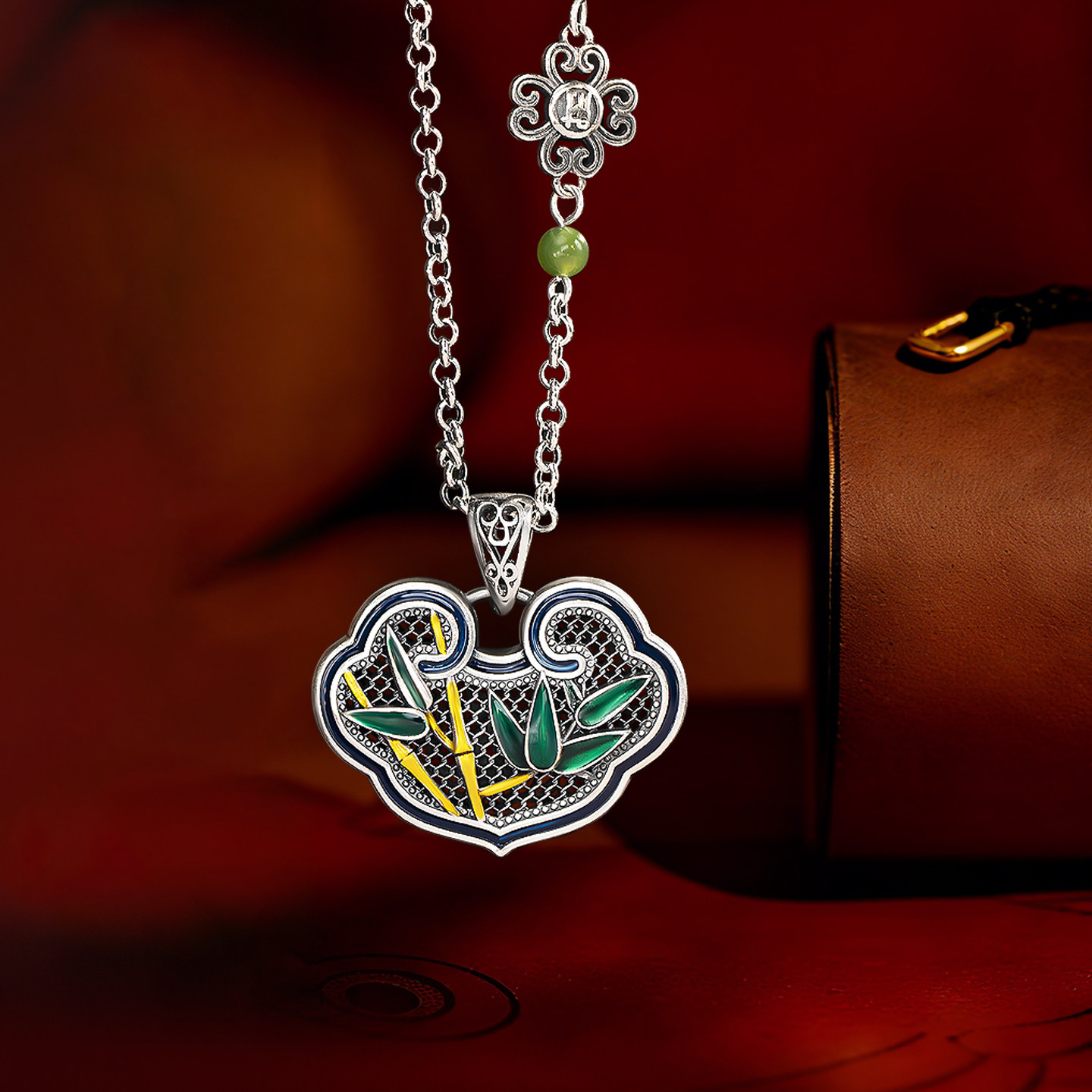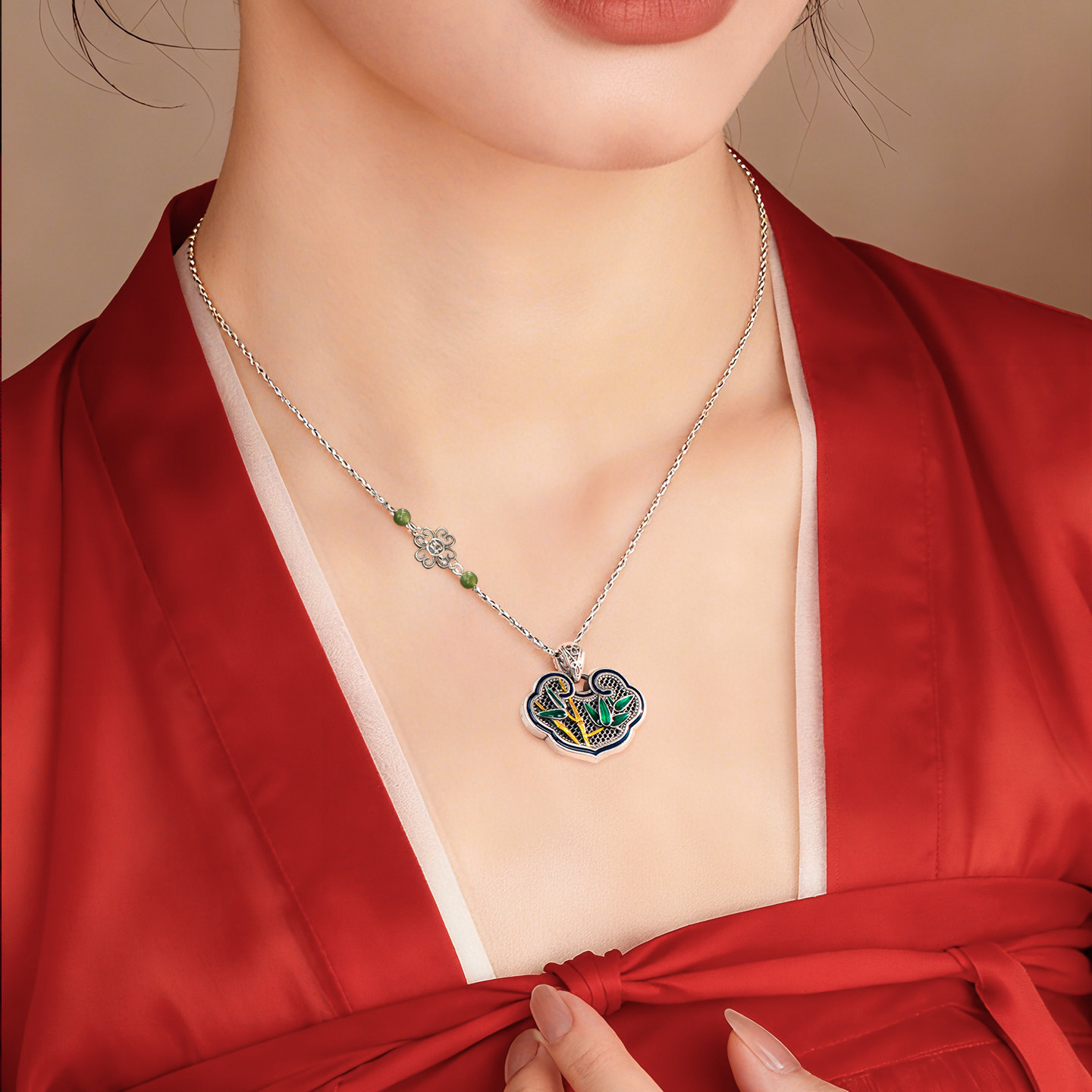 纯银平安如意锁项链女足银竹韵长命锁银饰挂坠花丝珐琅彩吊坠套装