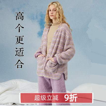 朵朵可可条纹珊瑚绒睡衣女士秋冬立领开衫羽毛绒家居服套装可外穿