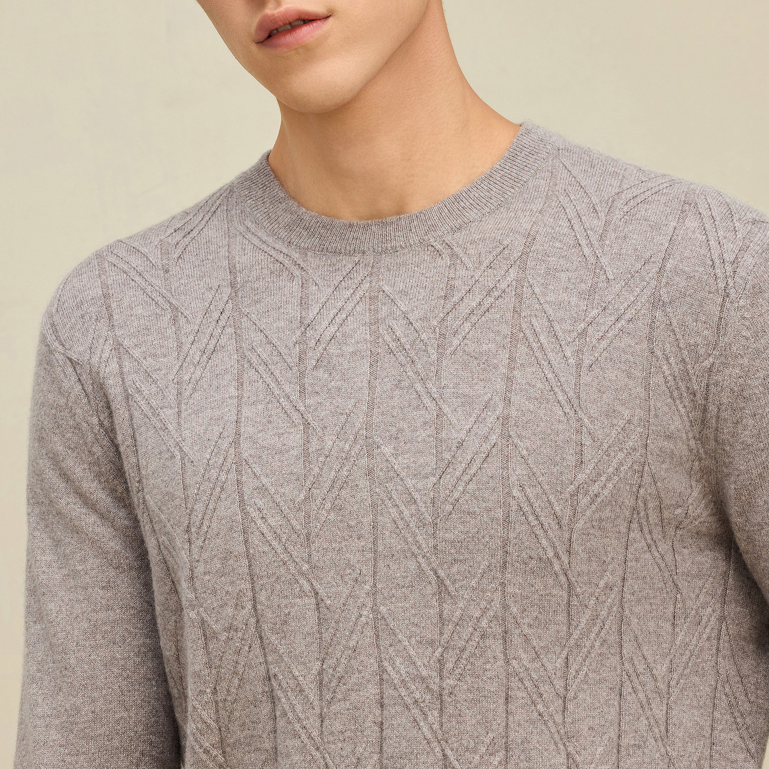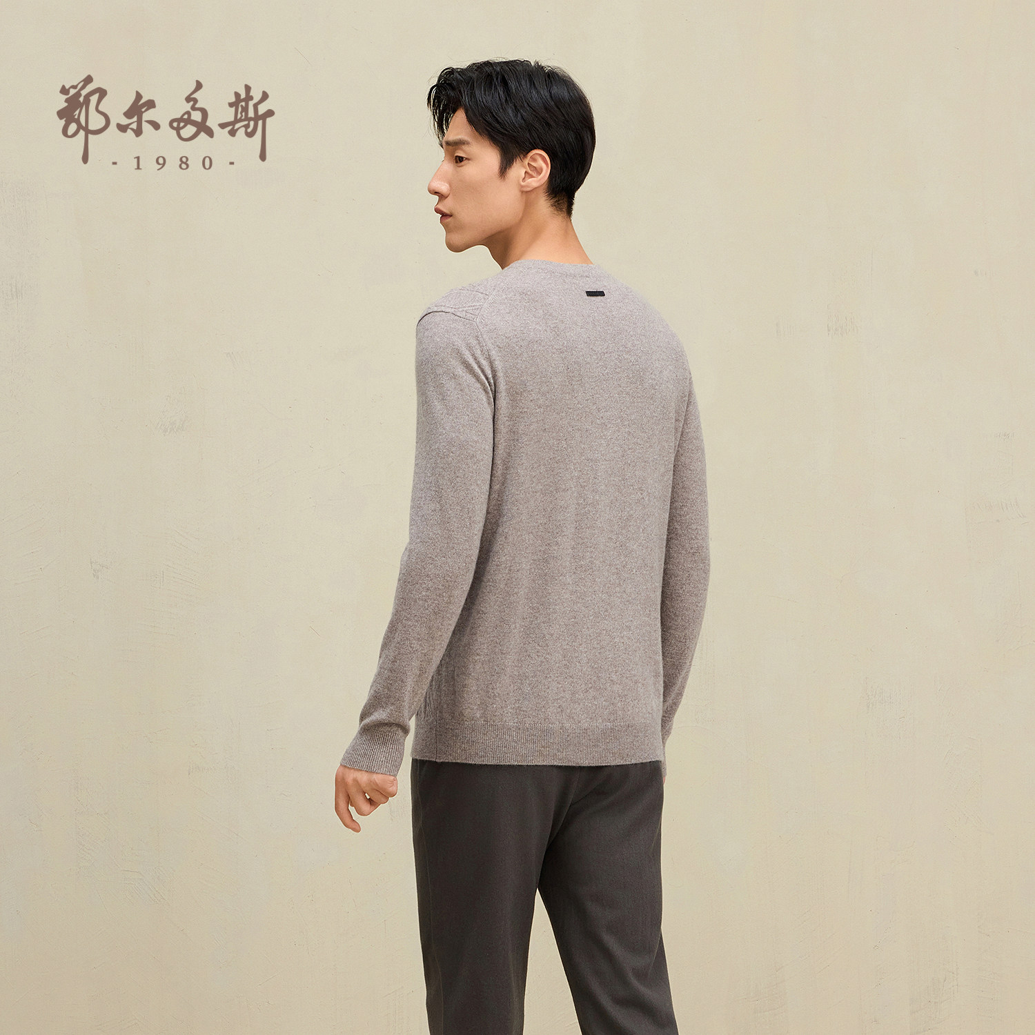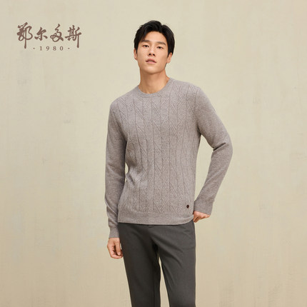 鄂尔多斯1980 圆领翻花羊绒衫2024年冬季男士纯色简约保暖针织衫