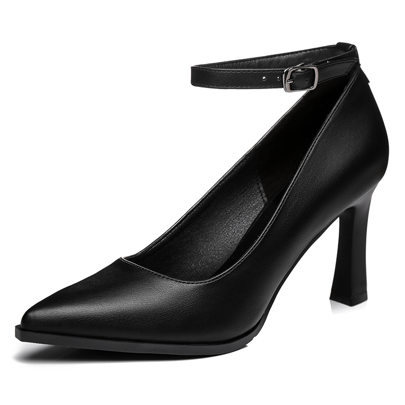 真皮软底粗跟单鞋女2024夏款尖头高跟一字扣带单鞋黑色面试工作鞋