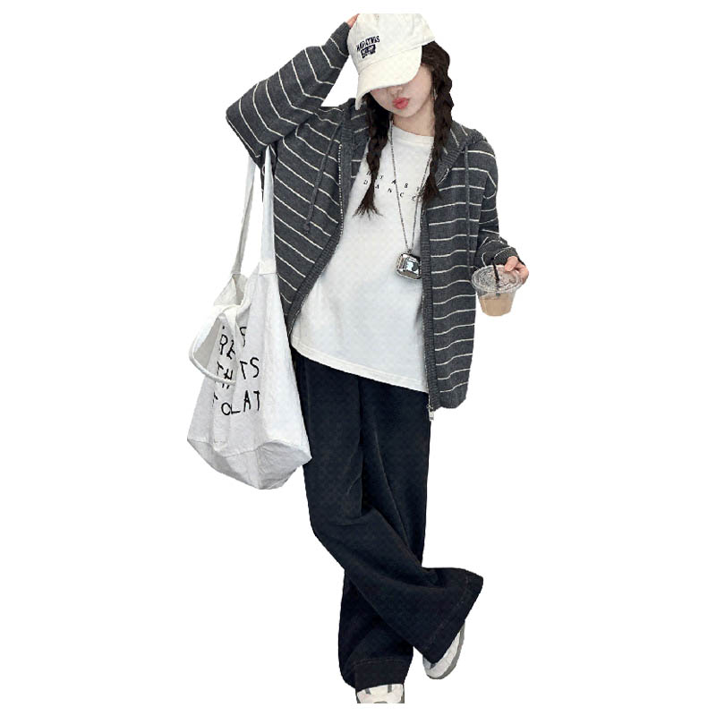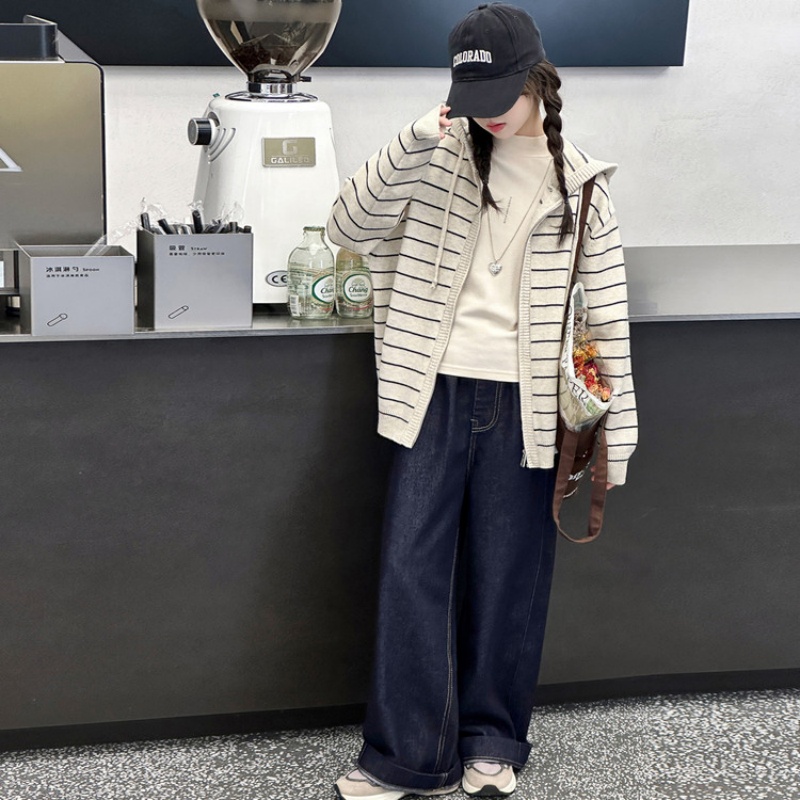 女童毛衣外套秋冬季加厚条纹儿童连帽休闲上衣女孩高级感针织开衫