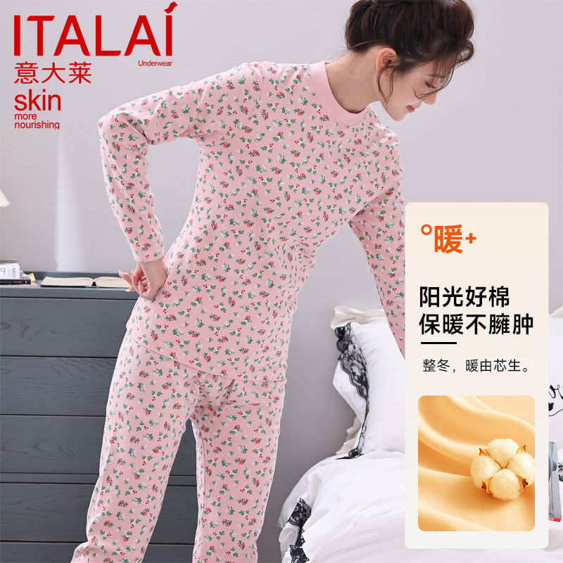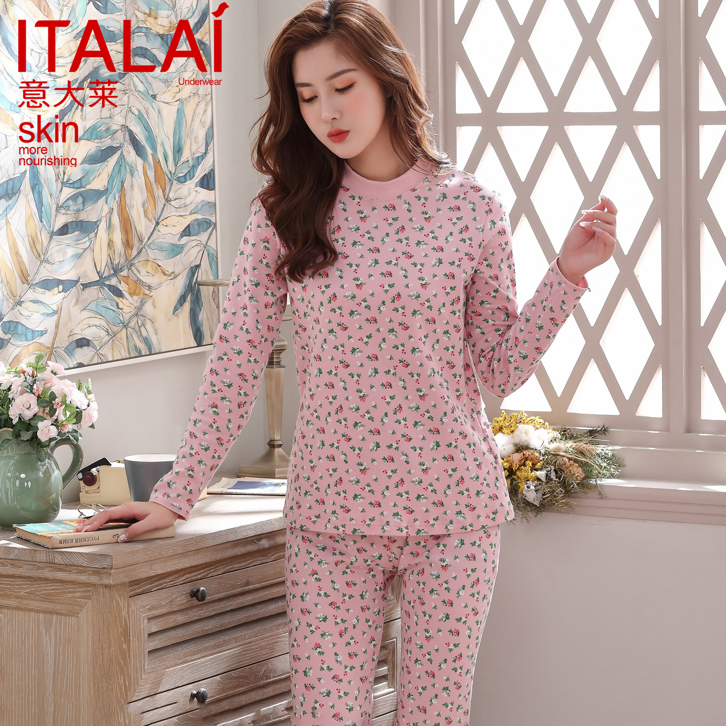 意大莱半高领秋衣秋裤套装女士纯棉薄款保暖内衣中老年大码棉毛衫