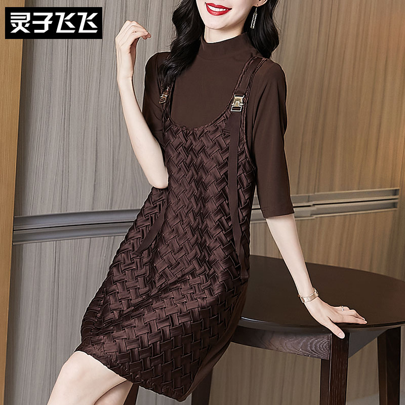 2021年秋季新款法式复古大码a字宽松显瘦格子背带假两件套连衣裙