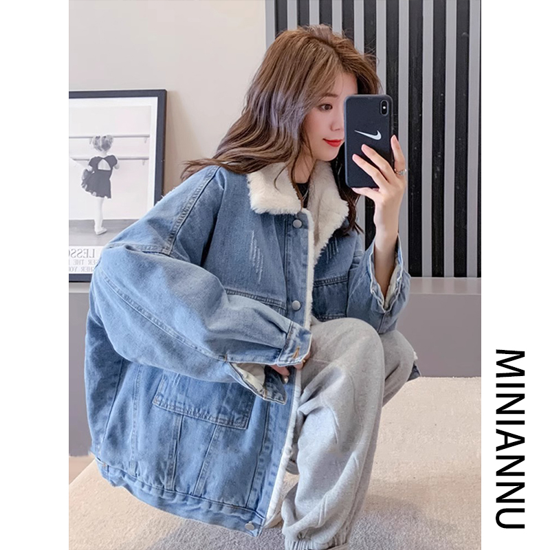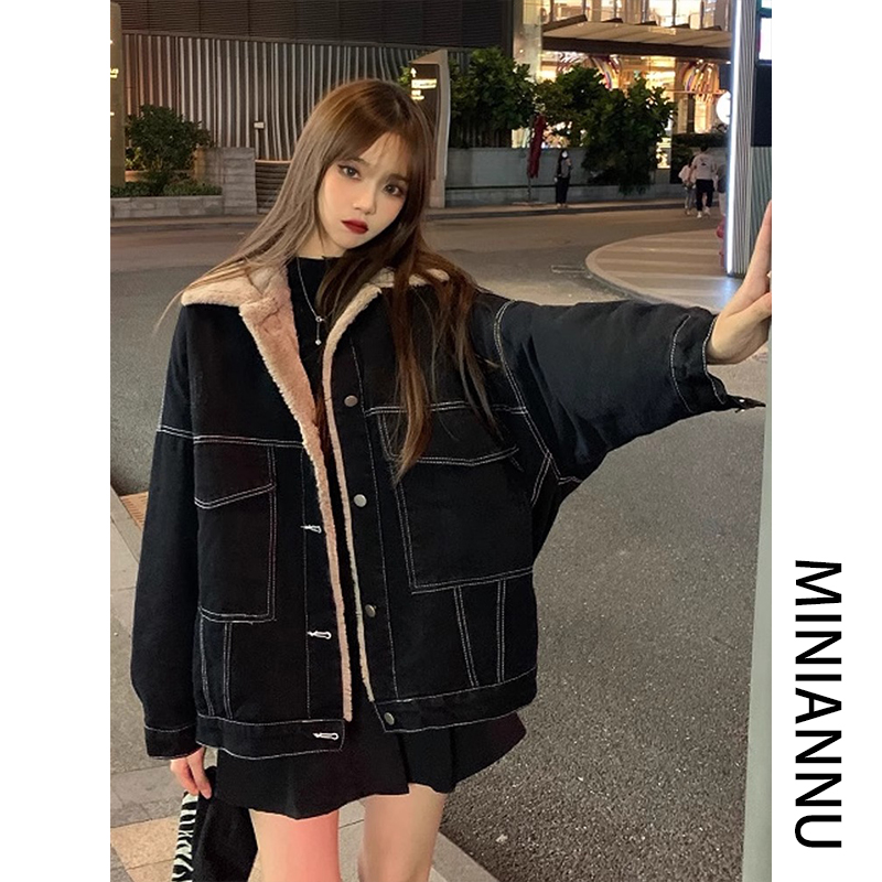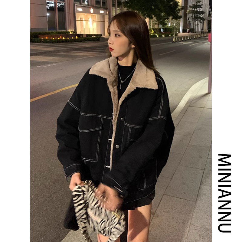 300斤特大码胖mm羊羔毛牛仔外套女韩版宽松学生黑色加绒加厚棉服