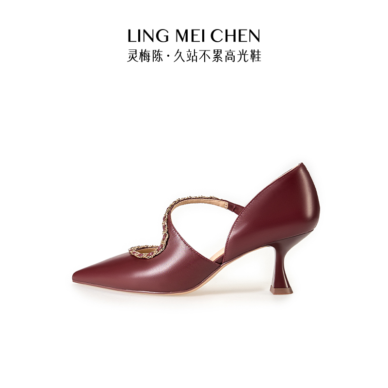 LINGMEICHEN酒红色高跟鞋法式镂空尖头单鞋夏季新款真皮凉鞋女鞋