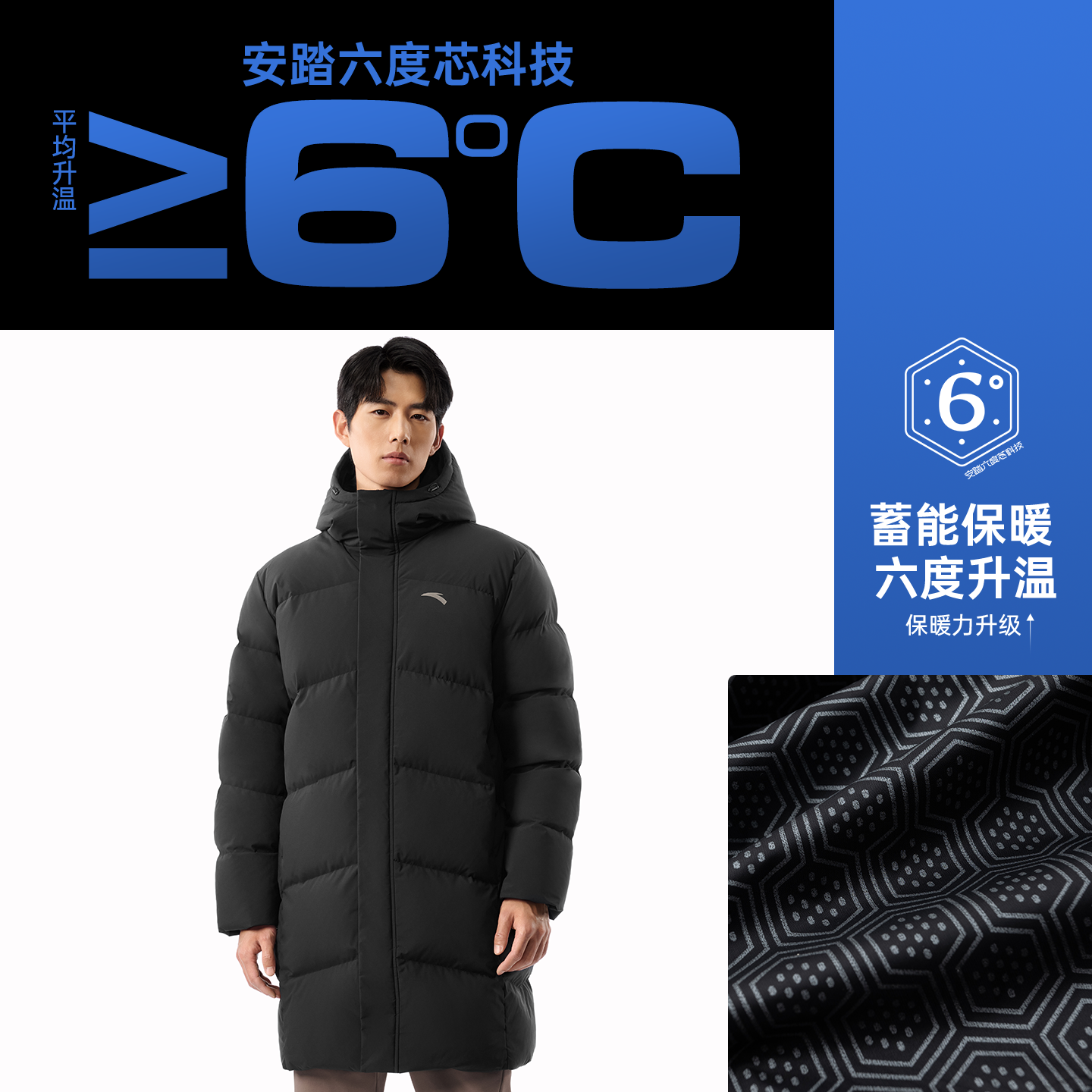安踏面包羽绒中长款男子冬季新款六度芯羽绒服鸭绒保暖棉服外套男