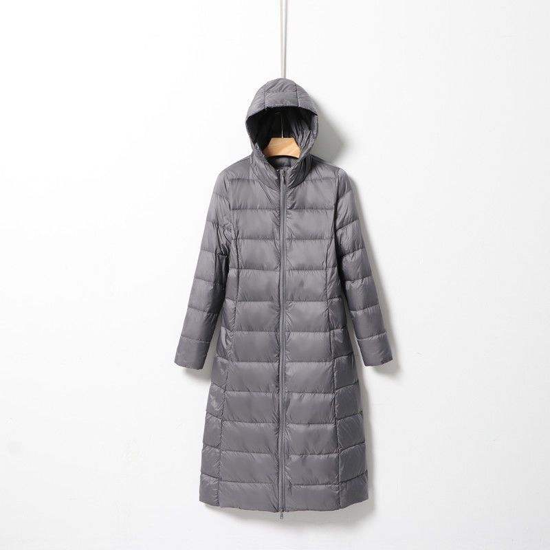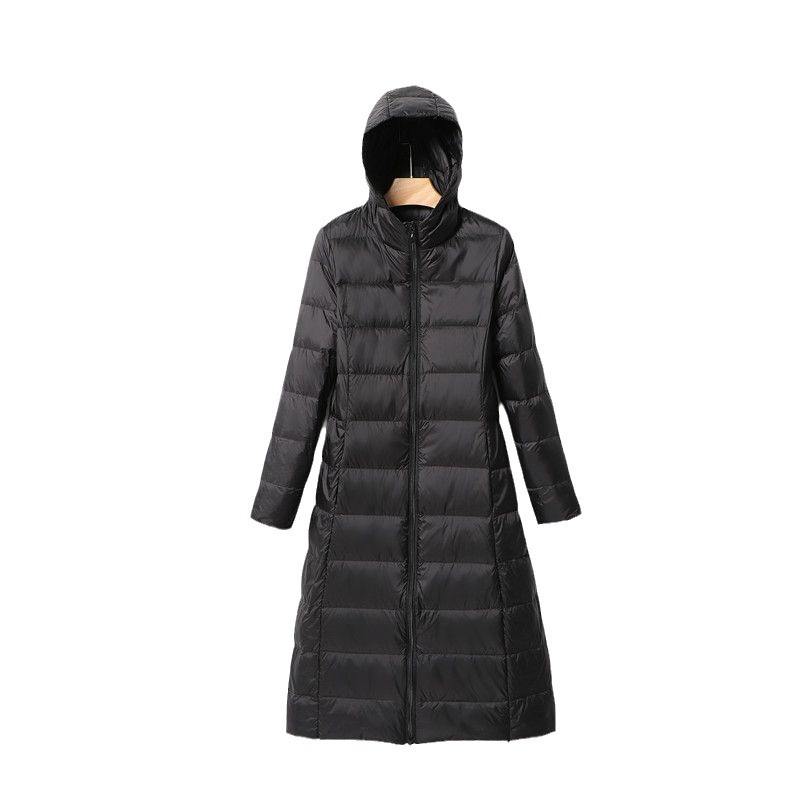 TikTok秋冬轻薄羽绒服女中长款过膝连帽修身薄款外套韩版长袖