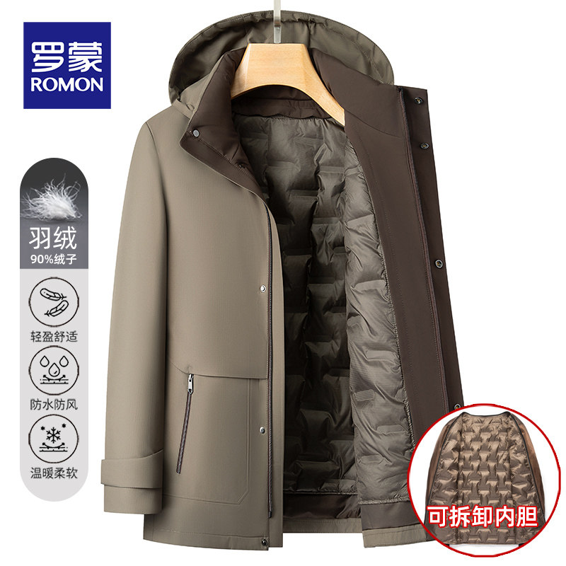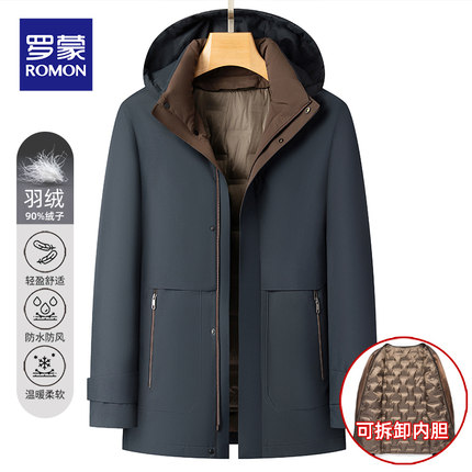 罗蒙男士可拆卸内胆羽绒服2025冬季中老年爸爸连帽派克服休闲外套