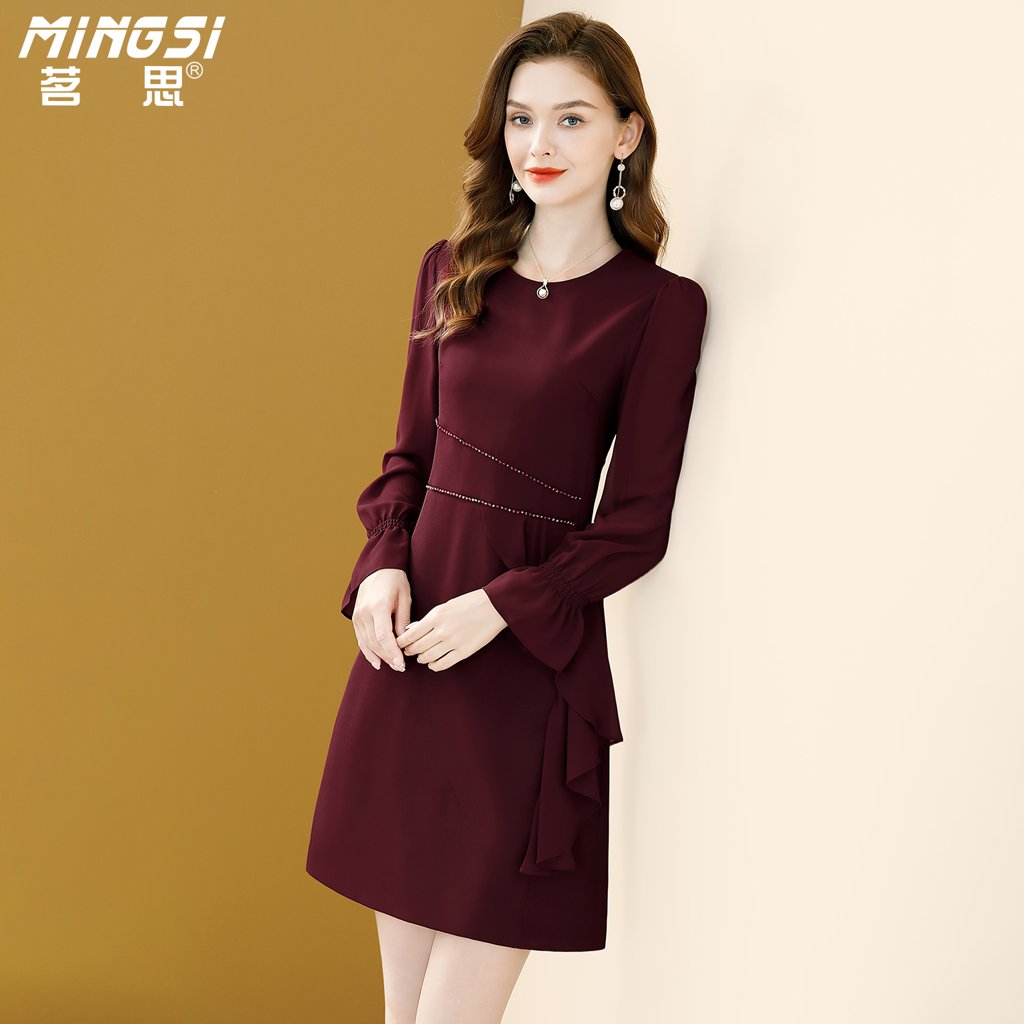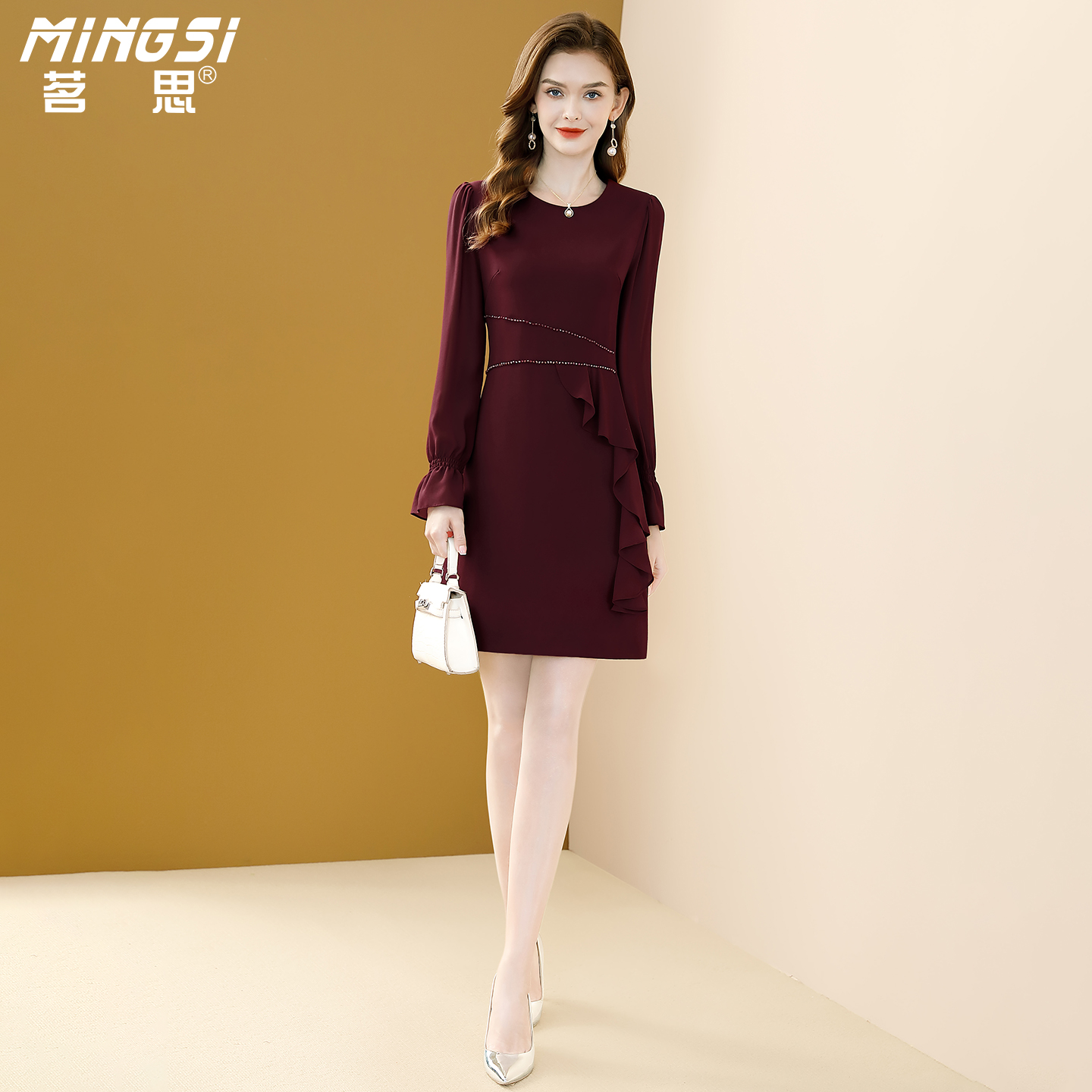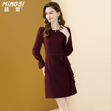 茗思名媛气质荷叶边连衣裙女2025秋季新款小个子钉珠减龄显瘦裙子