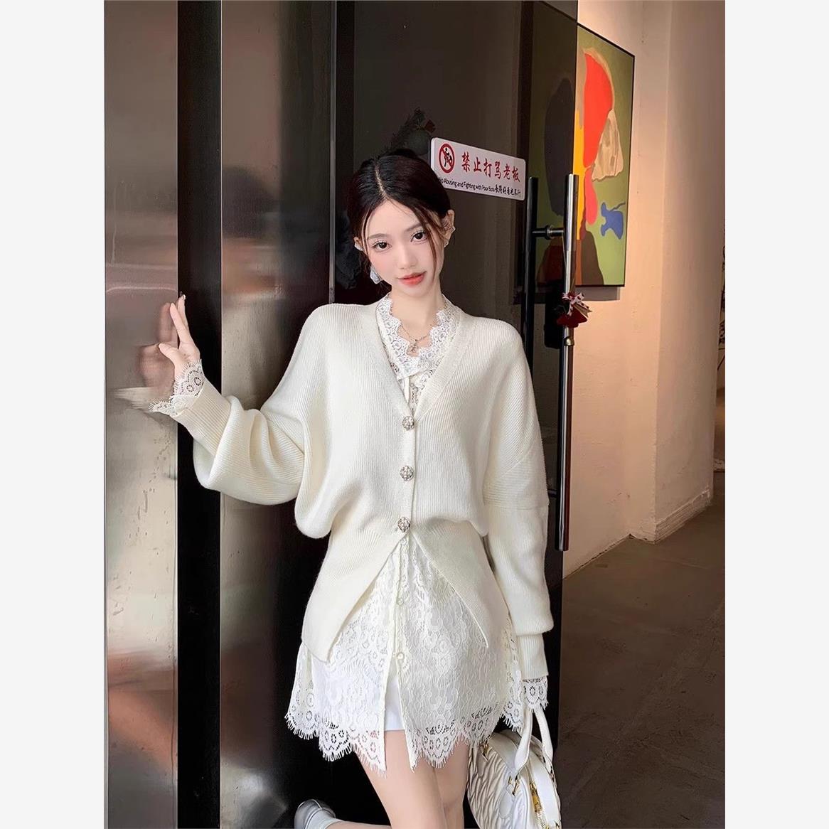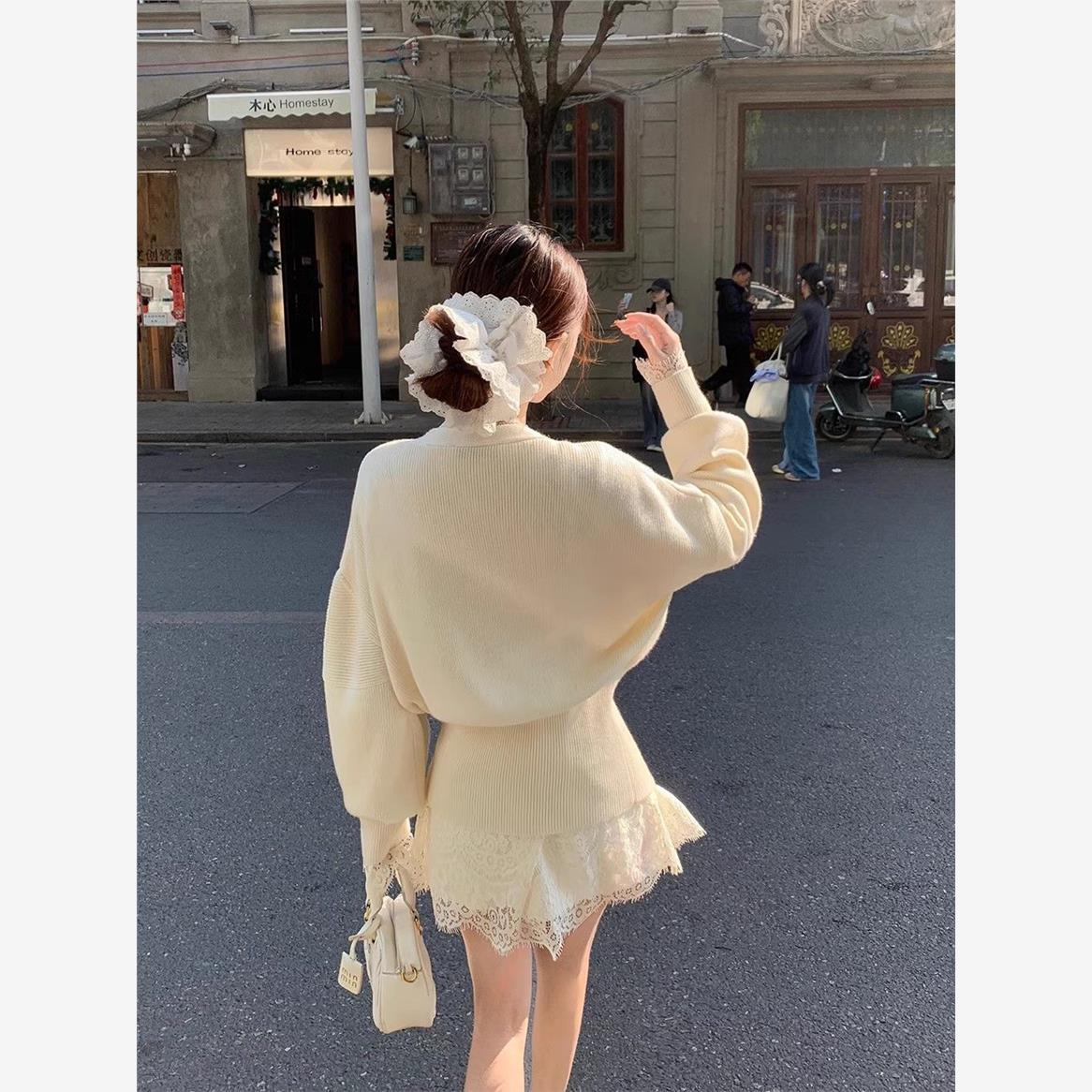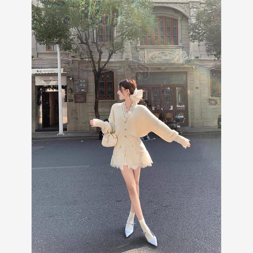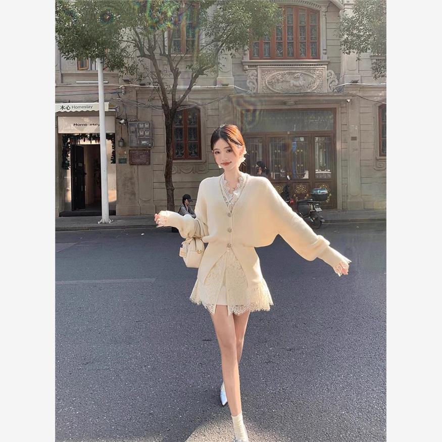 套装女秋季甜辣风穿搭一整套针织毛衣开衫蕾丝打底衫半身裙三件套