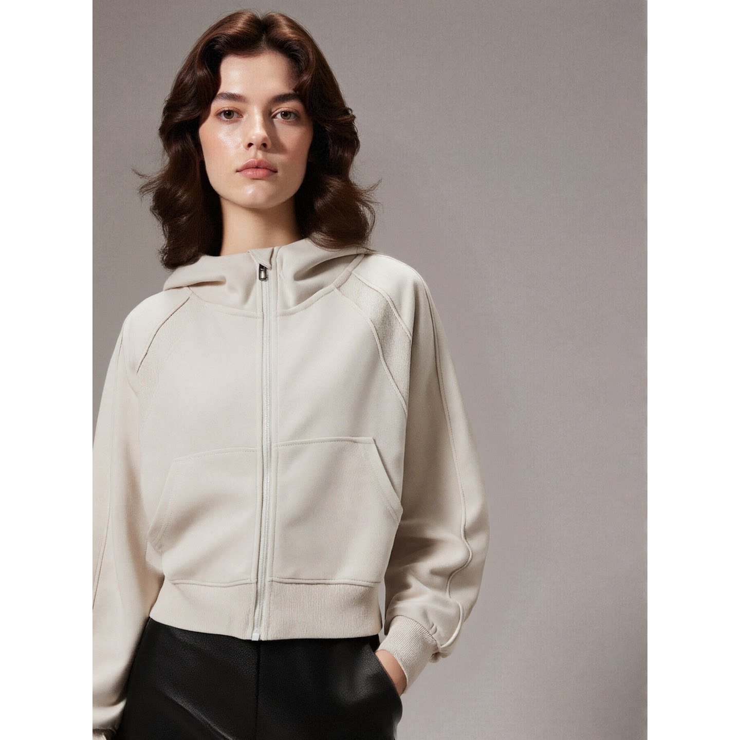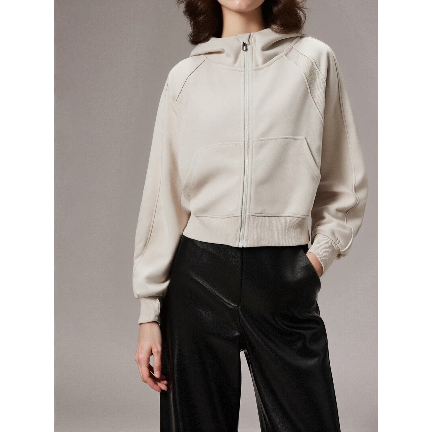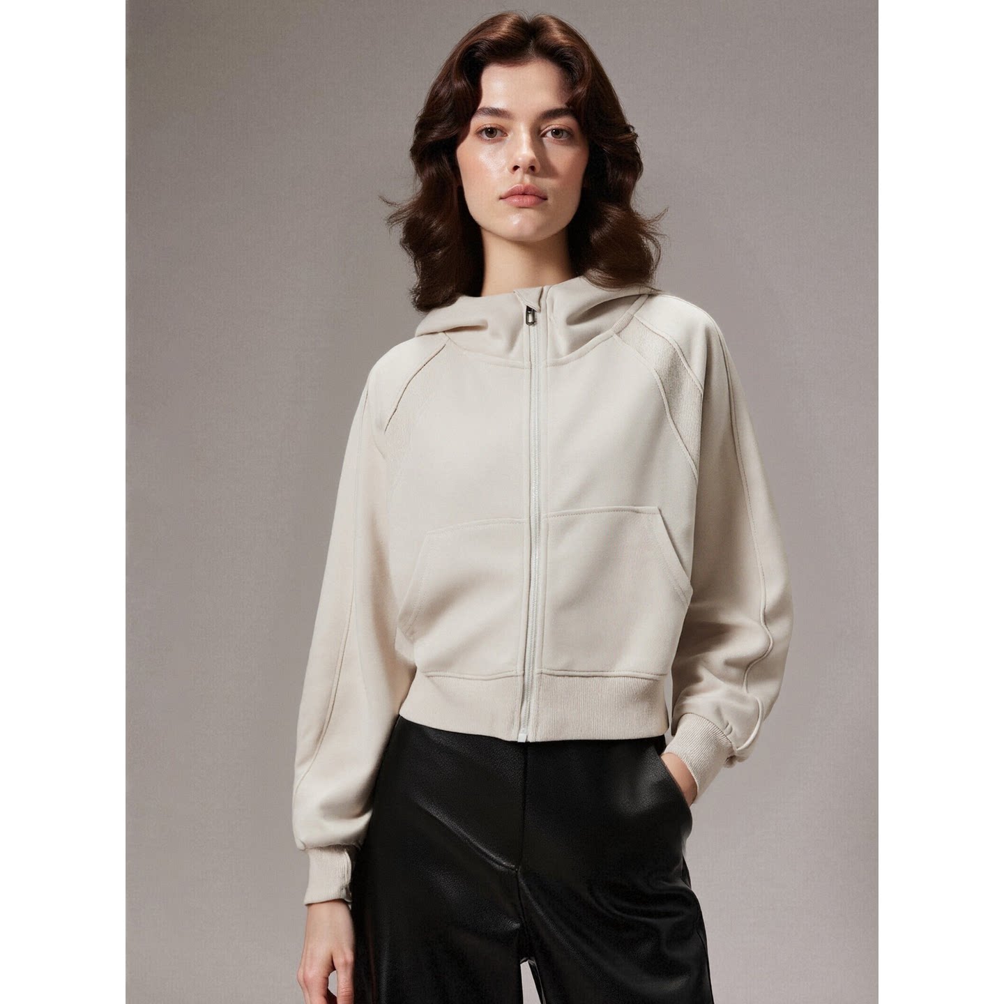 Basic House/百家好杏色连帽卫衣女2026春季新款美式短款拉链外套