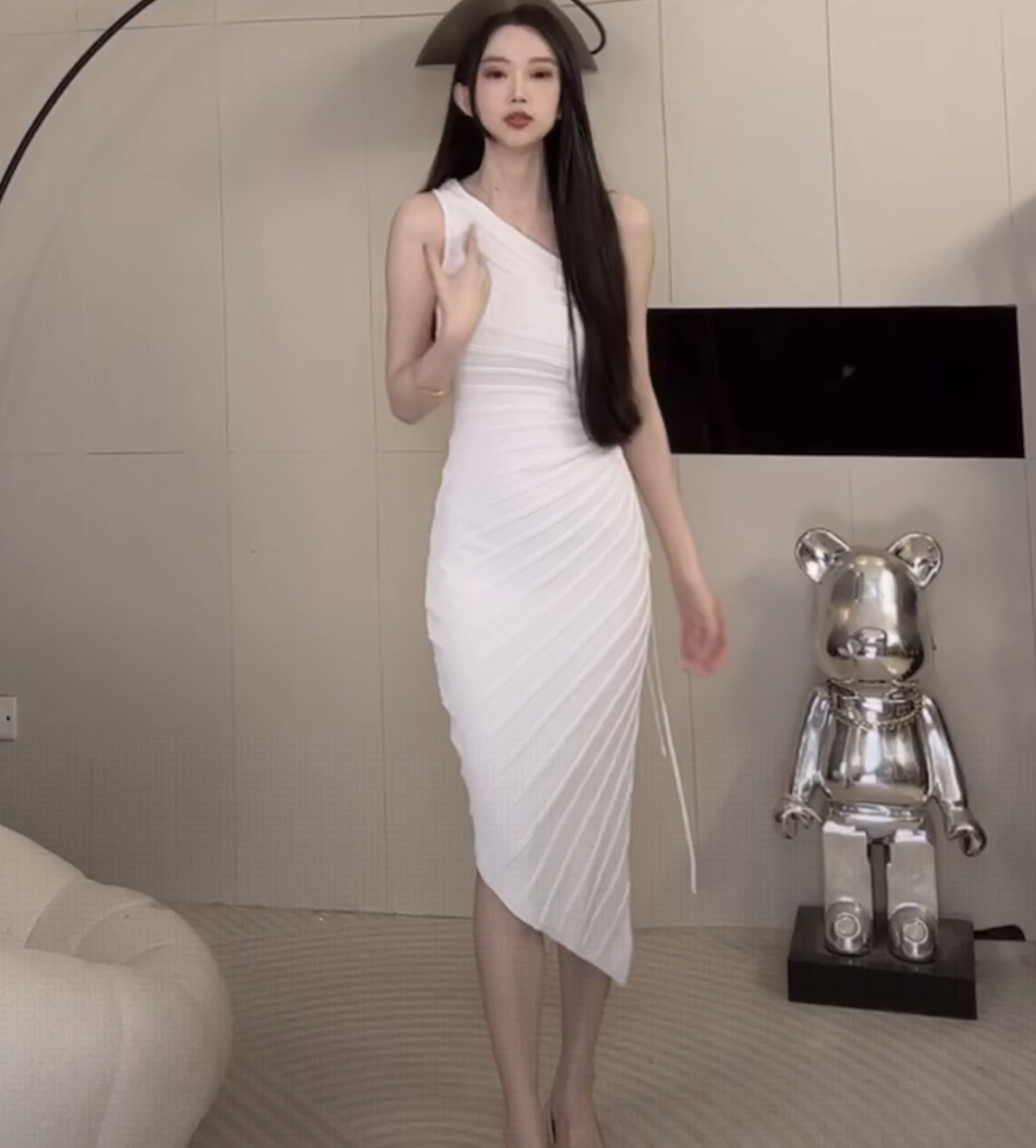 御姐风法式气质斜肩针织连衣裙女2025夏修身显瘦收腰包臀短裙礼服