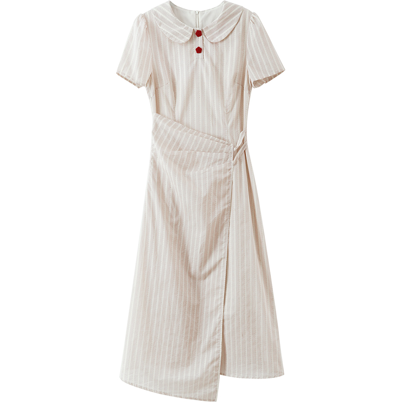 夕蒙2025新款夏韩系气质裙子减龄收腰小众翻领红色条纹短袖连衣裙