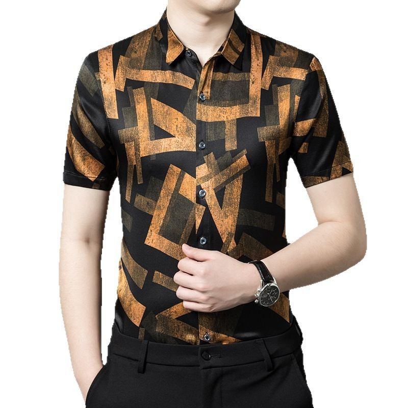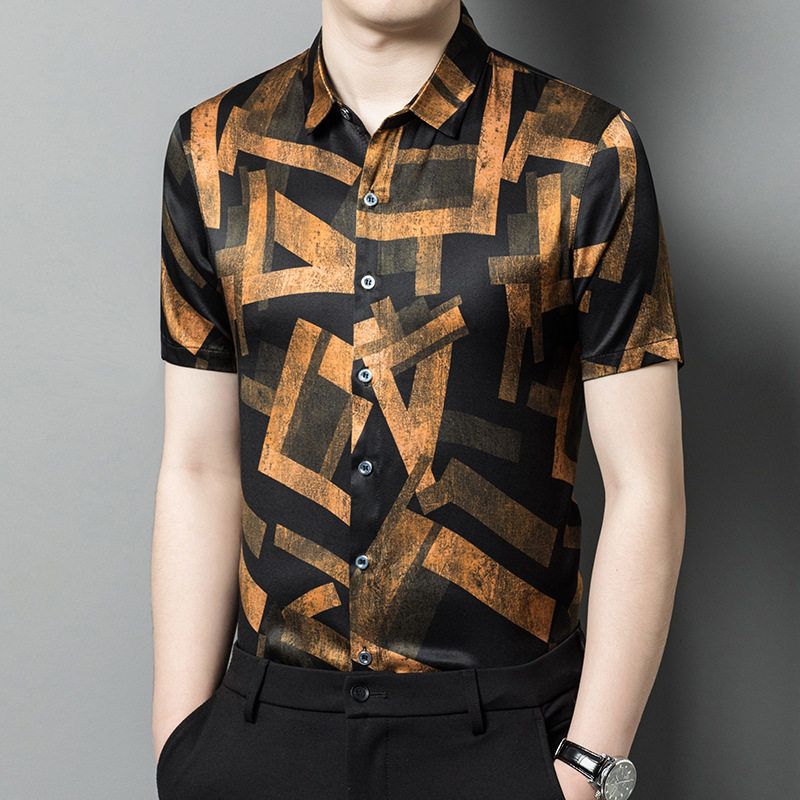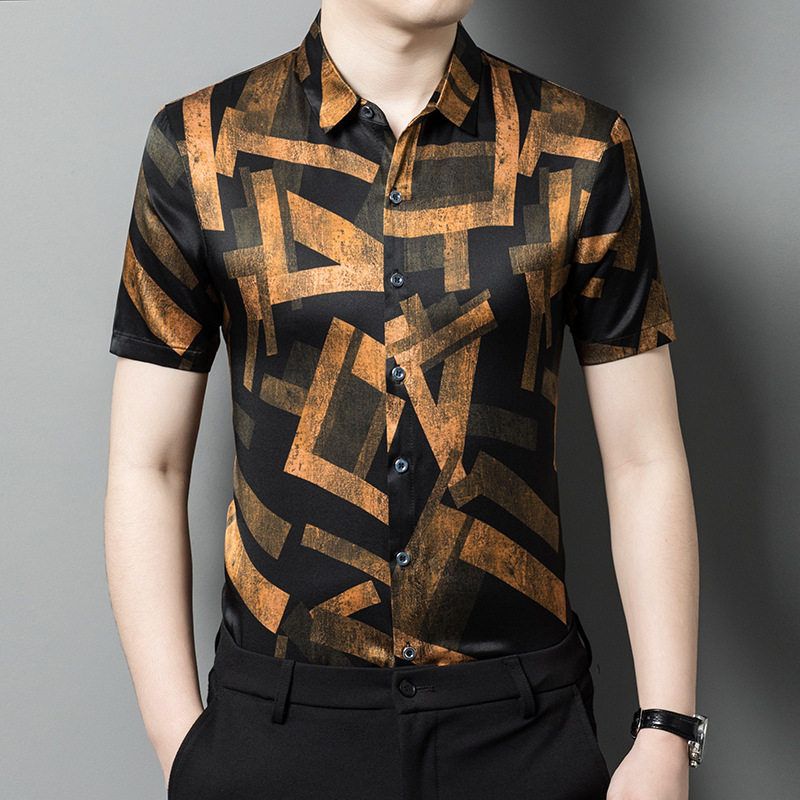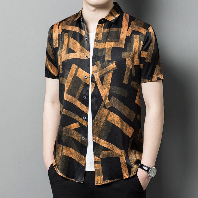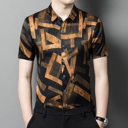 真丝短袖衬衫男装薄款印花桑蚕丝绸缎面衬衣潮流时尚帅气半袖上衣