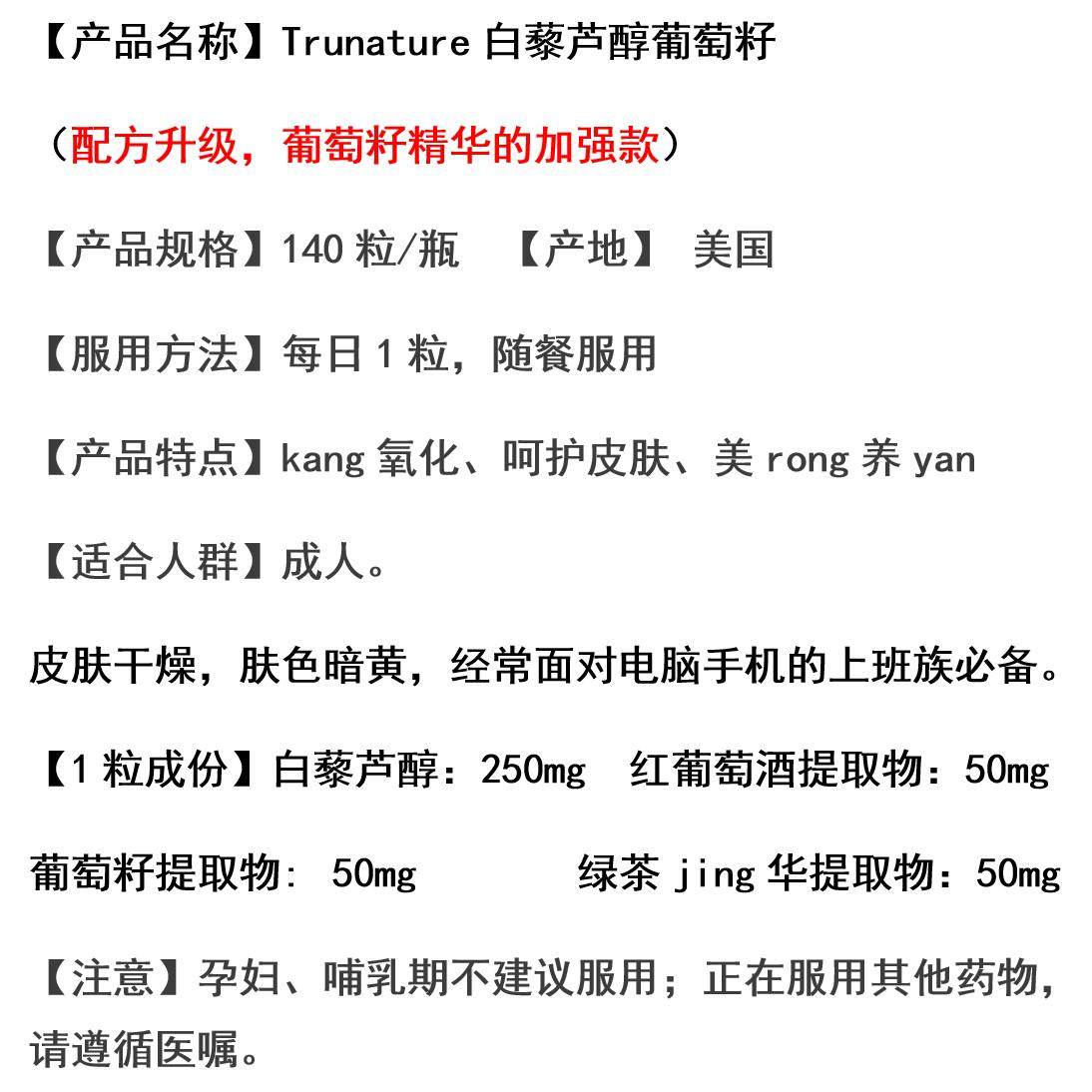 美国直邮Trunature葡萄籽精华素白皙白藜芦醇改善皮肤维生素140粒