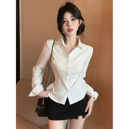 法式御姐气质POLO领修身长袖衬衫jk制服女秋冬收腰感小众职业衬衣
