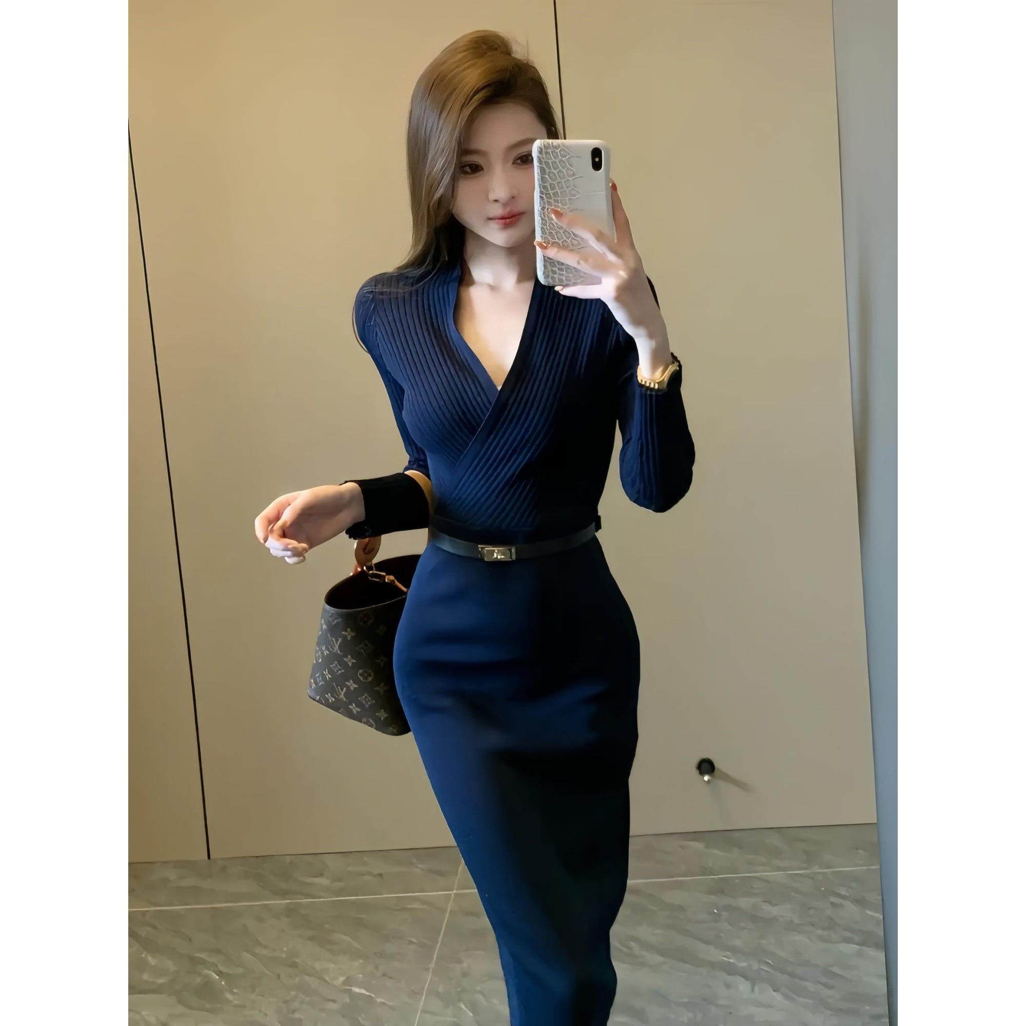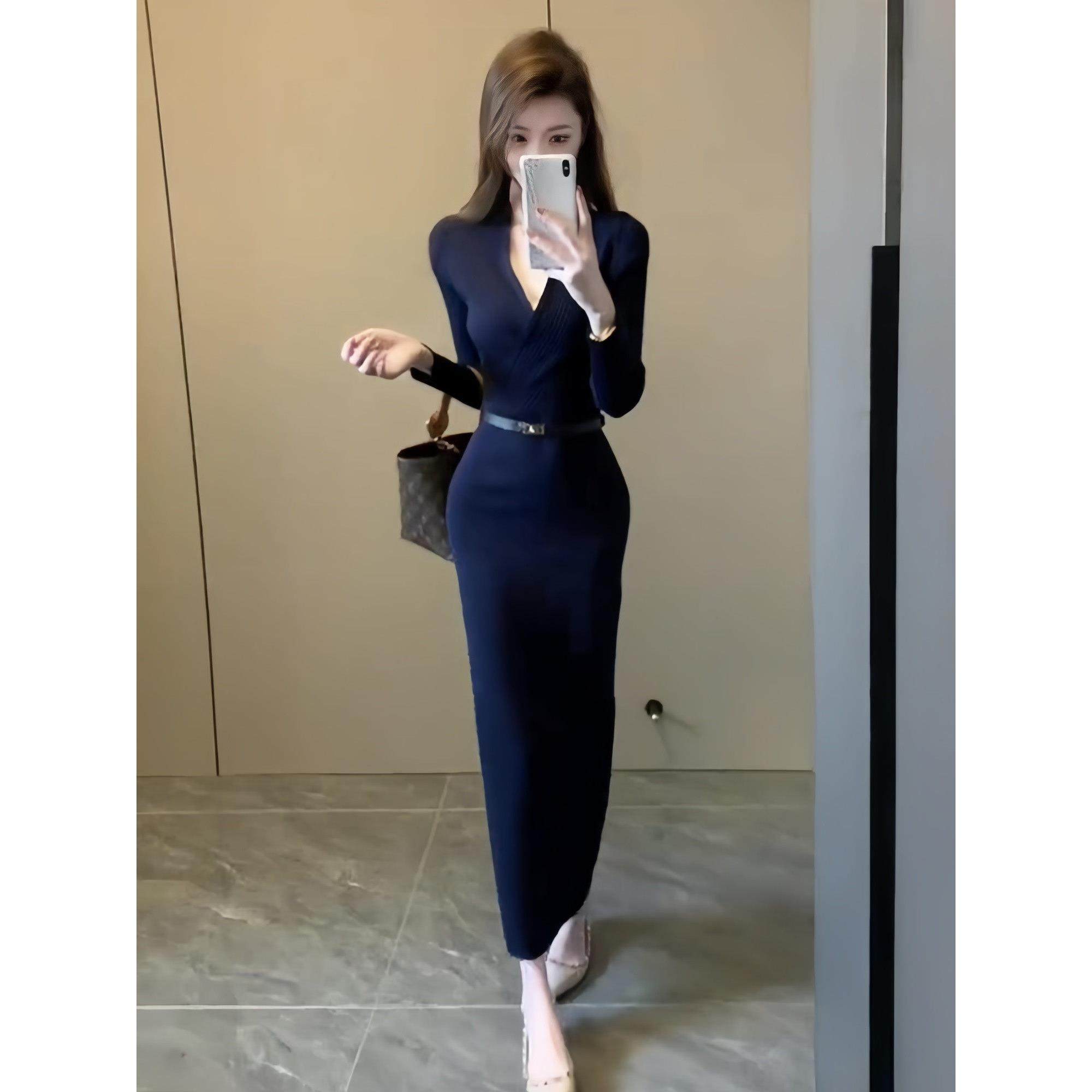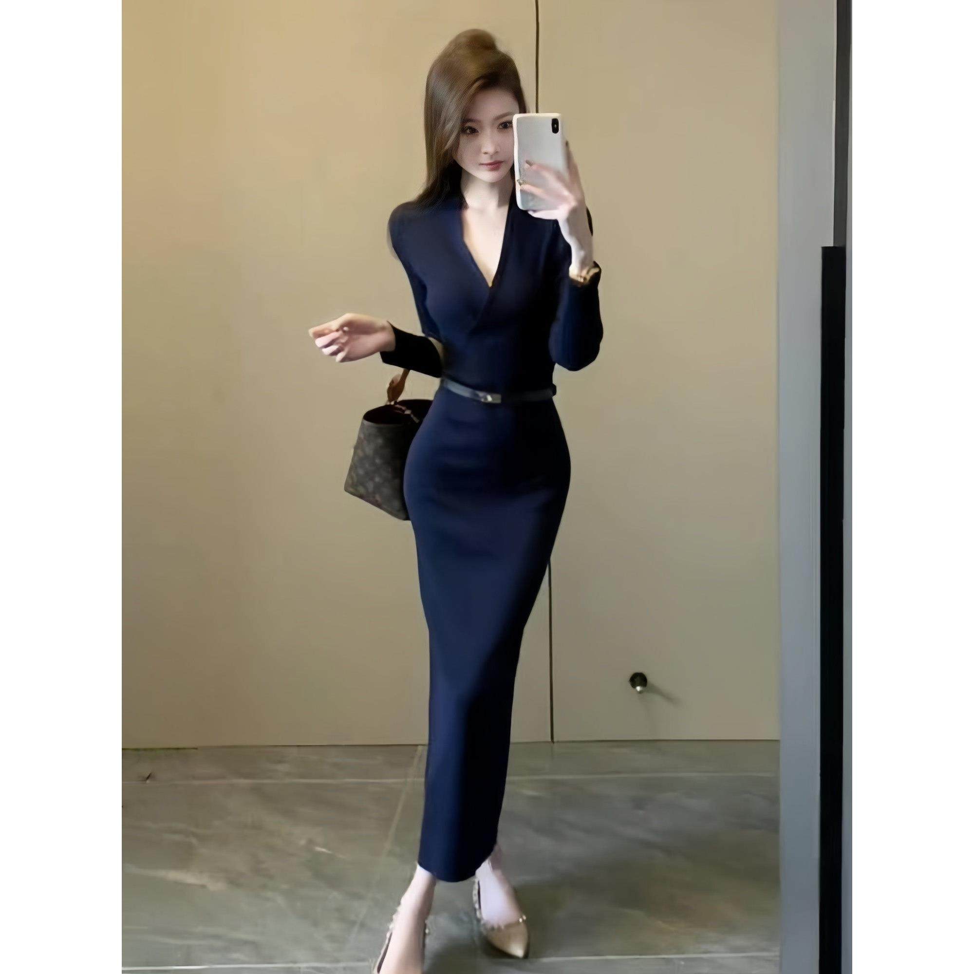 御姐风V领针织修身包臀连衣裙