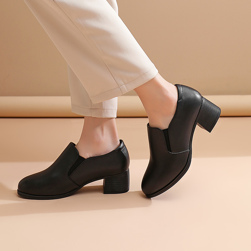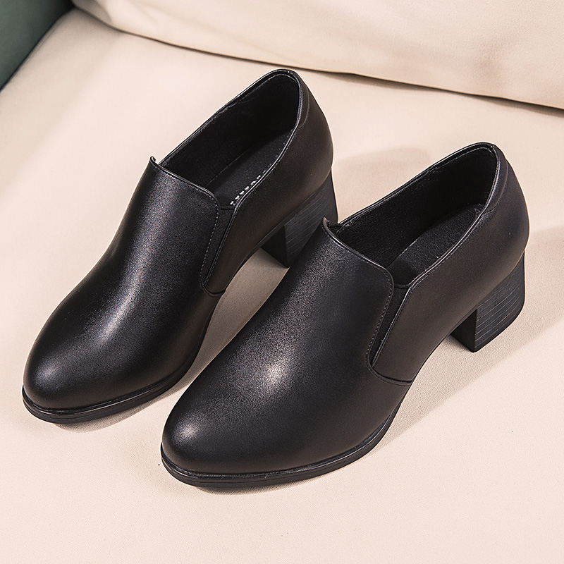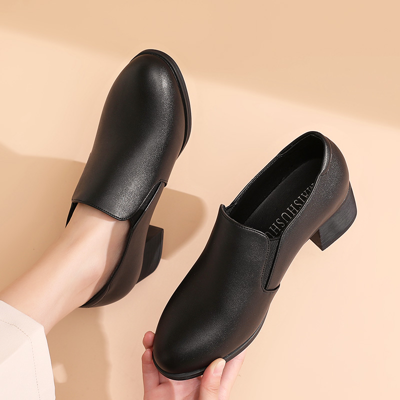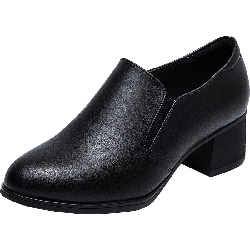 秋圆头粗跟女鞋软底黑色女皮鞋中跟深口单鞋正装职业工作鞋冬加绒