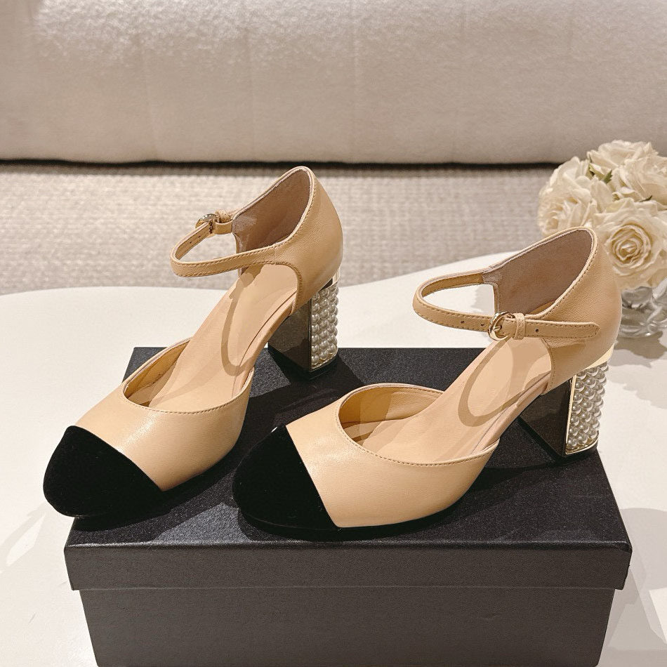 26新款经典小香风拼色中空高跟凉鞋高级感法式珍珠跟包头女鞋百搭